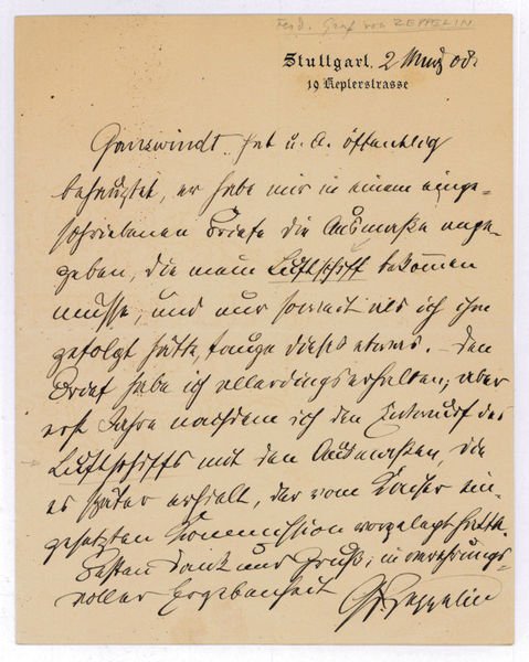 8vo. 1 p. on bifolium. In German, to an unknown recipient: "Ganswindt has publicly alleged to have sent me, by registered mail, the measurements which my airship must have, and that my airship can have any value only insofar as I followed his advice. - I did in fact receive such a letter, but only years after I had already submitted to the Kaiser's commission the design for my airship with the very measurements it later was to have [.]". - The East Prussian inventor Hermann Ganswindt (1856-1934) developed concepts for a space vehicle based on the principle of repulsion. His two-stage vehicle was designed to be driven by a series of dynamite explosions. Since it was to be taken aloft by way of a carrier vehicle, he designed a helicopter as early as 1884. Ganswindt's work is considered to be ahead of his time by several decades since his contemporary fellows had been unable to recognize the impact of his ideas. During his late years he kept in touch with Austrian rocket pioneer Max Valier as well as with German rocket pioneer Hermann Oberth, who shared his knowledge of Robert Goddard's work with him. - On stationery with printed address. Some browning due to paper, otherwise well-preserved.