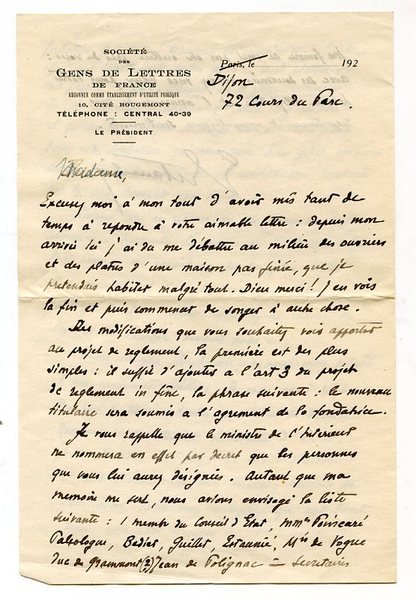 Large 8vo. 3½ pp. on bifolium. To Winnaretta Singer, Princess Edmond de Polignac: "Des modifications que vous souhaitez voir apporter au projet de reglement [!], la première est des plus simples: il suffit d'ajouter à l'art 3 du projet de reglement [!] in fine, la phrase suivante: le nouveau titulaire sera soumis à l'agrement [!] de la fondation. Je vous rappelle que le ministre d'interieur [!] ne nommera en effet par decret [!] que les personnes que vous lui aurez désignées. Autant que ma mémoire me sert, nous avions envisagé la liste suivante: 1 membre du Conseil d'Etat, MMes Poincaré Paléologue, Bedier, Guillet, Estaunié, Mis de Vogue duc de Grammont (?) Jean de Polignac - secretaires [!] MMes Morand et François Dupré. […] Sur le second - absence d'obligation de placer les dons en fond d'etat [!], - il y en a moins encore car le but de notre procedure [!] est precisement [!] de nous dispenser de cet ennui. Le texte n'imposant nulle part la necessité [!] d'un emploi de ce genre, il en resulte [!] que tous les modes d'emploi de valeur demeurent autorisés. Ce qui n'est pas defendu [!] est autorisé, tel est le principe de droit [.]".