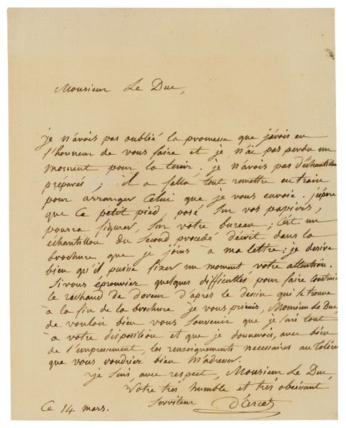 180 x 230 mm. 1 p. on bifolium. Presenting a specimen (a foot which could be used as a paper-weight) to an unnamed Duke. An attractive and clearly written letter. A pamphlet concerning a gilding furnace to which reference is made is likely to be the "Description d'un petit fourneau à coupelle, au moyen duquel on peu faire les essays des matières d'or et d'argent", which d'Arcet published in 1813.