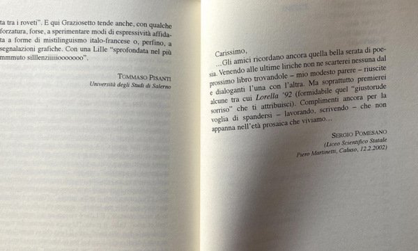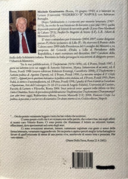 Il nostro Michele Graziosetto è forse più avvezzo alla veste di storico e saggista, dal momento che la sua produzione (se si può usare tale terminologia) o meglio la sua figliolanza poetica è scarna se paragonata alla veste produttiva più nota di storico-saggista. Ma d'altro canto, non potrebbe essere diversamente dal momento che alcune sue poesie sono piccoli cammei che hanno resistito all'impasse storico. C'è da ricordare che queste due raccolte sono riedizioni, le poesie scelte e centellinate come nettare che deve solleticare e stordire benevolmente il palato emozionale, hanno datazioni a partire dal 1967 fino ai nostri giorni più recenti. Il volumetto ?Altre poesie reca la dedica a Lorella e James e nell'ultima di impaginazione la dicitura stampato il 23 luglio 2008. Non sono dediche né date a caso. Il libretto è stato dedicato alla figlia Lorella che il giorno 23 luglio si è sposata. Dunque un'eredità a futura memoria e quasi un plauso d'animo di un padre ad una figlia. I giorni nel labirinto è dedicato invece alla moglie Marisa, cui sono rivolti molti versi d'amore.