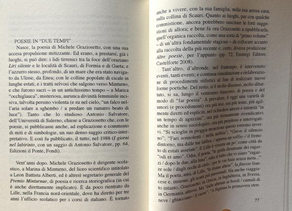 Ma per Graziosetto non è così, appare evidente che le emozioni le centellina e le lascia decantare come un buon vino d'annata. Seguono altre poesie che incastonano angoli suggestivi della nostra terra. Exemplum: Nel tuo dilagante azzurro nel mio cuore/ho risentito la voce dell'occhiglauca Marica./ All'ombra del Tempio di Saturno/ (ove dell'antica Minturnae i numi riposano)/dimentica dell'afa ossessiva/ tra le fronde del Liri silente/ E ancora da Taccuino di Viaggio: E ora di riposare/ - dice Thania-/ nell'antro antico/ di Torre Scissura,/dove l'onda bluastra/(gonfia e sfuggente)/smeriglia tra le alghe coralline/ Una scena che si frappone fra la terra e il mare, che sono radicati profondamente nel sentire del poeta, come della gente che di generazione in generazione è figlia di questi luoghi, ed è alla saggezza di questo binomio indissolubile che auguro a Michele Graziosetto di vergare altri smerigliati versi.