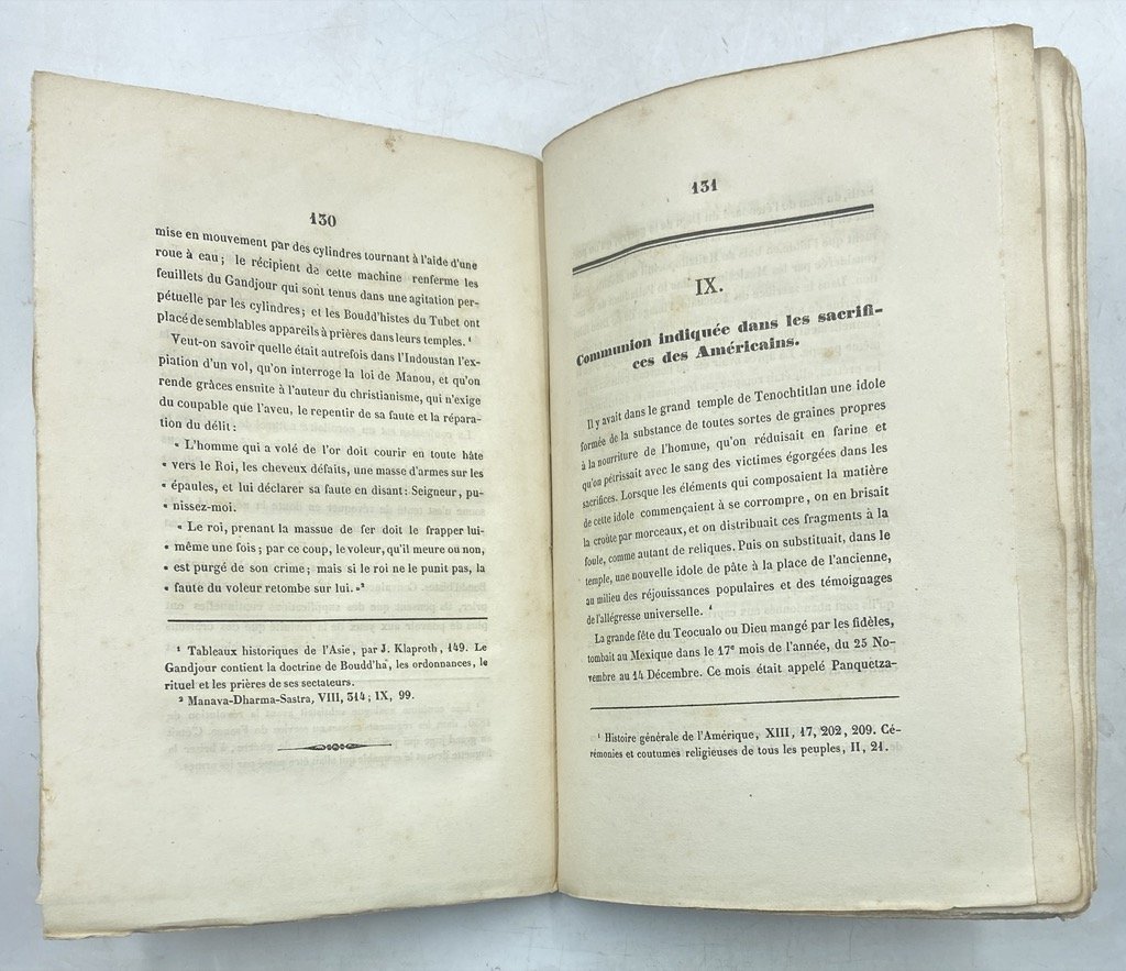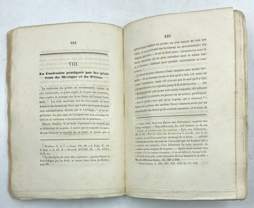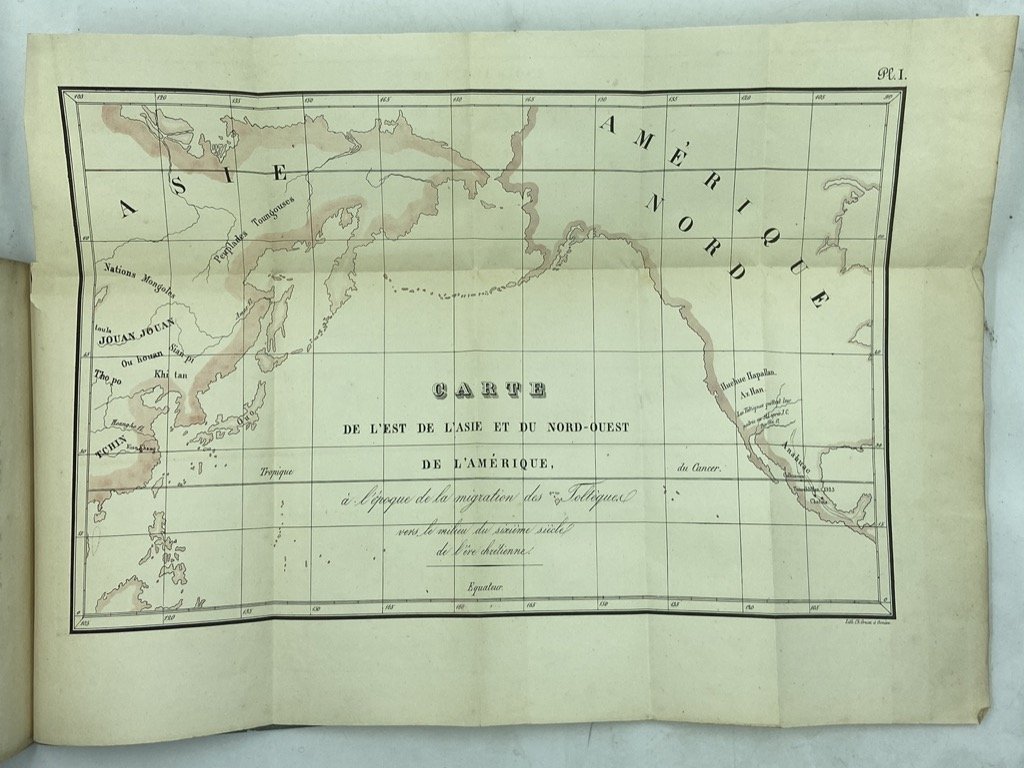 Brossura non editoriale in carta azzurra, muta, in ottavo cm 21 x 15, pp 195 (1), 2 carte ripiegate. Buon esemplare, seppur in brossura muta, completo e a pieni margini, in barbe e con testimoni. Alcune antiche segnature a margine di qualche paragrafo, a china, e poche annotazioni a lapis, più recenti. Al verso dell'occhietto piccola pecetta con data manoscritta e sul fronte firma di proprietà a matita. Curioso studio comparatistico sulle tradizioni religiose dei popoli precolombiani, condotto sulla base di un'impostazione di esegesi biblica cattolica. L'autore ipotizza un'origine asiatica dei Toltechi, e un precedente contatto con le tradizioni ebraiche e protocristiane che sarebbe all'origine di similitudini riscontrabili tra i costumi religiosi dei popoli americani e i riti europei e cristiani. La citazione di Joseph De Maistre posta sul frontespizio funge da spunto per l'indagine: «Les voyageurs modernes ont trouvé en Amérique: les vestales, le feu nouveau, la circoncision, le baptême, la confession, et enfin la présence réelle, sous les espèces du pain et du vin». Tra i temi della ricerca: i miti del diluvio e della dispersione dei popoli (Babele), il battesimo, la confessione dei peccati in Perù e Messico, il matrimonio presso gli Aztechi, la comunione, le feste dei morti, le istituzioni sacerdotali e monastiche. Accompagnano lo studio una grande «Carte de l'Est de l'Asie et du Nord-Ouest de l'Amerique à l'époque de la migration des Toltèques vers le milieu du sixième siècle de l'ere chrétienne» e un'affascinante tavola, colorata a mano, che mette a confronto la torre di Babele con i teocalli mesoamericani e presenta alcune immagini da manoscritti aztechi e altre fonti antiche. L'opera conobbe una seconda edizione (Lovanio 1845); Kastner pubblicò anche un simile studio che metteva a confronto le Scritture con le tradizioni dell'India.