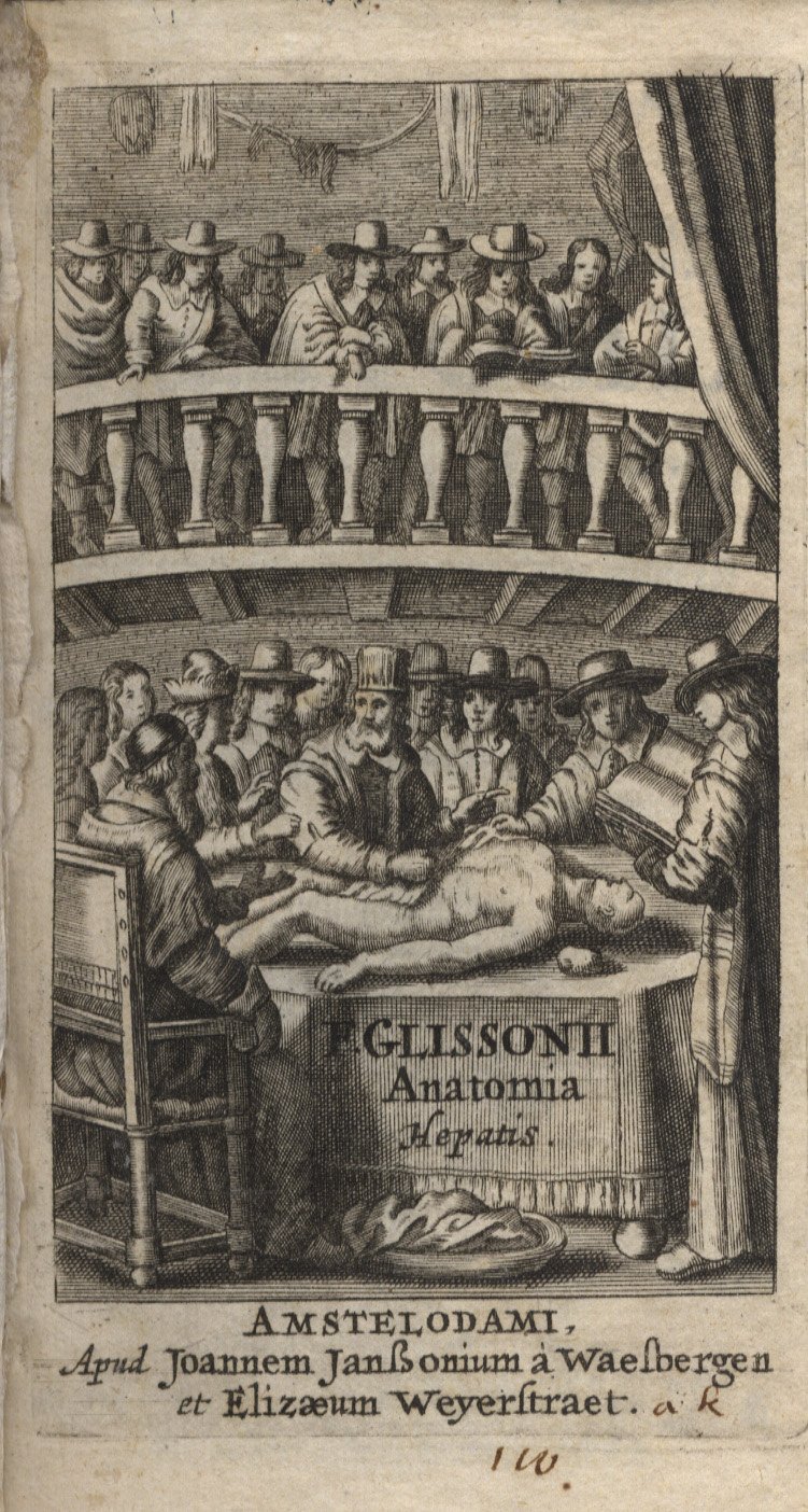 >in-12, pp. (48, compr. tit. inc.), 423, (19). Leg. coeva p. perg., tit. ms. al dorso a nervi. Con grazioso antiporta inc. raffig. un animatissimo teatro anatomico e aula di dissezione, 2 tavole inc. in rame ripieg. f.t. raffig. il fegato, alcune figure silogr. nel testo. Rara edizione (la prima era apparsa a Londra nel 1654) di interessante e rara opera sull'anatomia del fegato, di cui viene data ampia e dettagliata descrizione. La prima parte del volume espone nozioni di anatomia generale. L'autore (1597-1677) fu celebre medico inglese che ha dato, tra l'altro, il nome allo sfintere del dotto biliare. Esempl. perfetto. Krivatsy 4820.