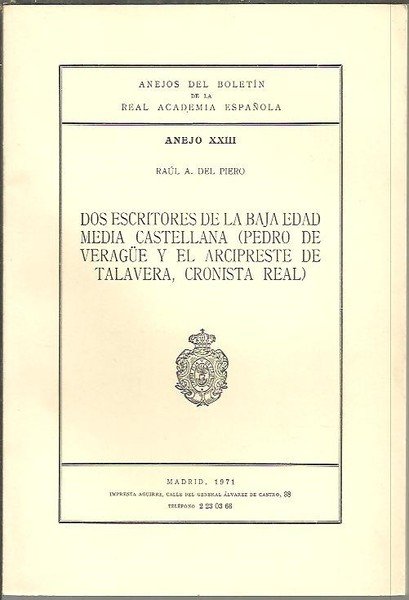 ANEJOS DEL BOLETIN DE LA REAL ACADEMIA ESPAÑOLA. ANEJO XXIII. DOS ESCRITORES DE LA BAJA EDAD MEDIA CASTELLANA (PEDRO DE VERAGUE Y EL ARCIPRESTE DE TALAVERA, CRONISTA REAL).
