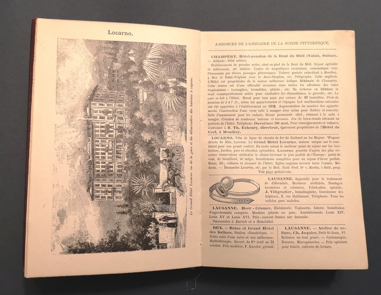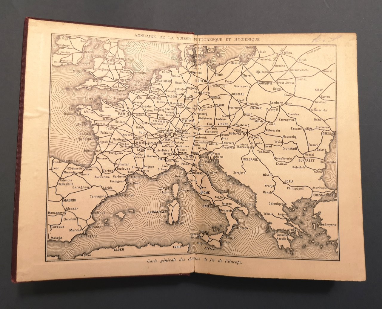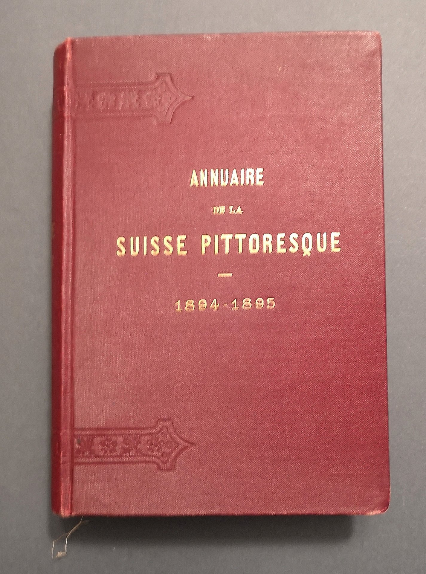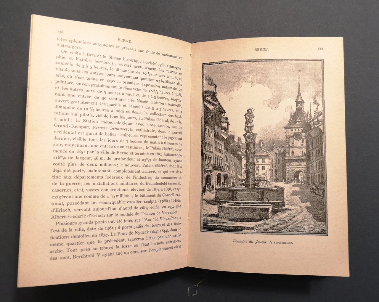>in-16, pp. (8) di reclame turistica svizzera, 532, (4), illustrate da vedute in nero n.t., anche a piena piagina. Leg. in tela editoriale con titoli in oro e impressioni a secco, tagli marmorizzati, sguardie decorate con la carta geografica delle ferrovie europee. Quarta edizione di questa fortunata guida al turismo svizzero. Perfetto esemplare.