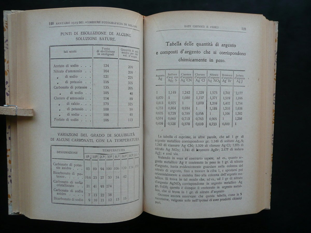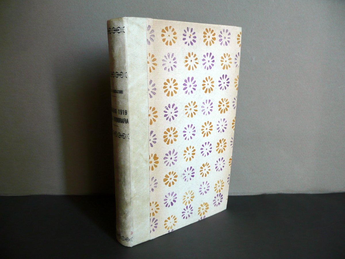 Prof. M. Cacciatori, Annuario 1919 della Fotografia Con l'Elenco generale dei fabbricanti, negozianti e fotografi dell'Italia A. G. Dell'Acqua Editore, Milano 1919, cm 18,5x11,5, pp. 1-318; pp. I-CIV (Appendice) con numerose inserzioni pubblicitarie d'epoca in b/n; legatura in mezza pergamena con titolo al dorso; piatti con bella fantasia a colori. Condizioni di conservazione: Esemplare in buone condizioni con leggere tracce di utilizzo; dorso con qualche lieve alone. Interni buoni con minimi accenni d'ingiallimento del tempo ai margini delle pagine. Primo annuario fotografico ad essere stato pubblicato, con numerose inserzioni pubblicitarie d'epoca in bianco e nero. Opera di rilevante contenuto tecnico. L'appendice contiene gli elenchi generali dei fabbricanti, negozianti e fotografi d'Italia divisi per regioni. SETT89.L8142 P/ST40