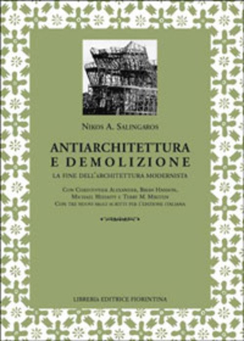 Dettagli Libro<br><br>Sku: PZZLB29900<br>ISBN: 9788889264874<br>Titolo: Antiarchitettura E Demolizione. La Fine Dell'architettura Modernista<br>Autore: Nikos A. Salingaros<br>Editore: Libreria Editrice Fiorentina<br>Anno: 2000<br>Pagine: 228<br><br>Questo libro è l'inizio di un contrattacco atteso e dovuto: l'autore, docente all'Università del Texas, espone la critica radicale di uno scienziato alla distruttività delle ultime tendenze architettoniche. Il decostruttivismo, ultima moda degli architetti, rivela la vera natura di tutto il modernismo, che è distruttiva della citt?, della società e della cultura umana. Infatti ha prodotto quel mondo di città invivibili, rumore incessante, distruzione di matrici naturali, con la relativa popolazione incivile, pericolosa, egoista e con tutti i conseguenti orrori, per cui la societ? avanzata sta diventando un incubo, nel quale anche gli edifici sono distorti, deformati e minacciosi. La lettura di questo libro, diretto a chiunque si interessi di architettura, dovrebbe essere obbligatoria nelle istituzioni dove si insegna progettazione, pianificazione e altri aspetti dell'ambiente costruito.