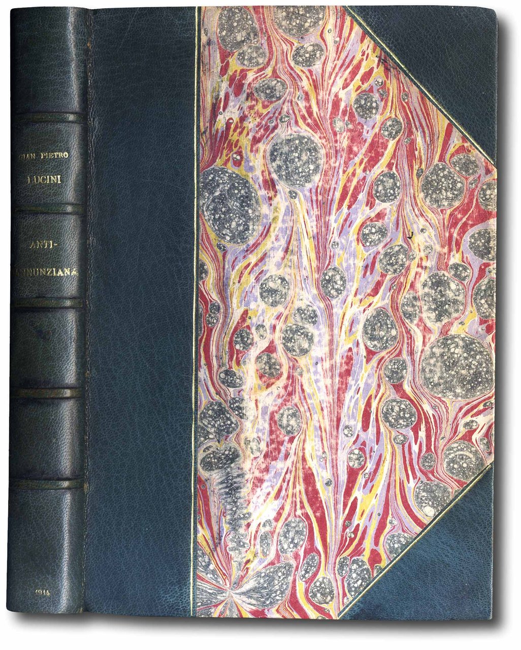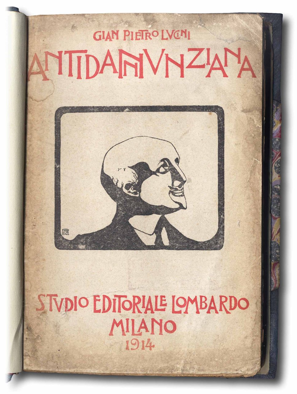 >in-8, pp. 334, legatura d'amatore in m. marocchino verde foncé e angoli, titolo e data in oro al dorso, conservata la copertina (usurata al margine sup. e inf.) impressa a due colori con ritratto satirico di D'Annunzio xilografato. Edizione originale di non banale saggio di questo autore lombardo prima considerato di transizione tra Ottocento e Novecento, ma in realtà poi rivalutato come precursore delle neoavanguardie. Tramite il dannunzianesimo, al quale lo univa l'amore sensuale della parola, dalla scapigliatura lombarda si avvicinò al Futurismo In quest'opera si libera dell'influenza del Vate, così come l'anno prima si era staccato clamorosamente da Marinetti, malgrado nel 1908 avesse pubblicato l'anticipatrice Ragion poetica e programma del verso libero . Bell'esemplare, in elegante rilegatura.