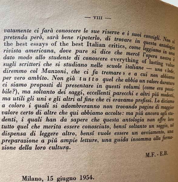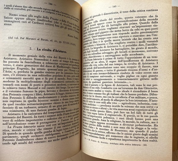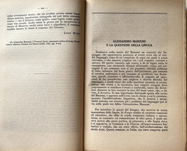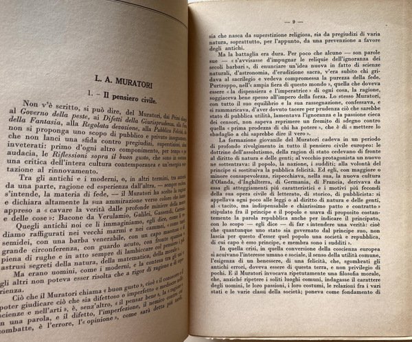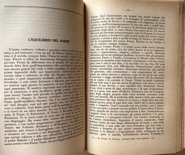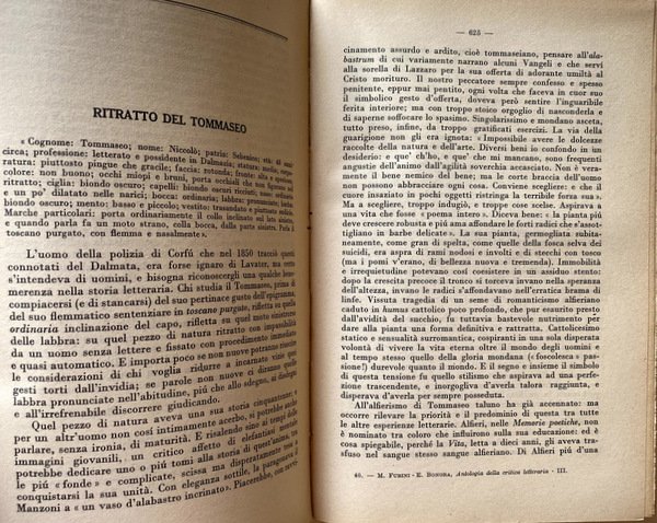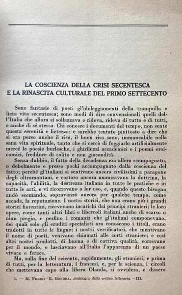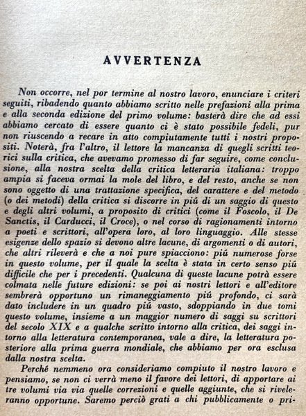 Soggetti: Critica letteraria, Letteratura italiana, Letture critiche, Interpretazione, Storia letteraria, Generi letterari, Studi culturali, Opere generali, Raccolte, Autori, Prosa, Poesia, Poetica, Filosofia, Narrativa, Teatro, Mentalità, Ottocento, Novecento, Correnti letterarie, Manuali, Classici, Edizioni critiche, Musicalità, Coscienza, Crisi secentesca, Eroismo filosofico, Scienza nuova, Linguistica, Lingua, Italianistica, Italiano, Rolli, Minori, Istoria civile, Giannone, Napoli, Intellettuali, Rinascita culturale, Libri Vintage Fuori catalogo, Collezionismo, Didattica, Libri scolastici, Storia della critica, Storicismo, Stilistica, Secolo XIX, Metastasio, Demetrio, Scrittori, Romanzo storico, Romanzi, Letture, Saggi, Settecento, Teatro, Burlesco, Società civile, Cesare Beccaria, Dei delitti e delle pene, Giuseppe Parini, Pindemonte, Ossian, Aneddotica, Romanticismo, Pensiero, Benedetto Croce, Ludovico Muratori, Illuminismo, Pietro Verri, Il Caffè, Umanesimo, Vittorio Alfieri, Tragedie, Rime, Monti, Iliade, Biografie, Equilibrio, Rivolta, Avaro, Borghesia, Commedia dell'arte, Goldoni, Traduzioni omeriche, Odissea, Leopardi, Poesie, Idilli, Infinito, Sepolcri, Grazie, Classicismo, Jacopo Ortis, Operette morali, Zibaldone, Canti, Pessimismo, Berchet, Esilio, Conciliatore, Carlo Porta, Alessandro Manzoni, Promessi Sposi, Morale, Cristianesimo, Religiosità, Cattolicesimo, Liriche, Adelchi, Realismo, Ricordi, D'Azeglio, Patrioti, Risorgimento, Gioberti, Idealismo, Silvio Pellico, Mie prigioni, Mazzini, Belli, Sonetti, Giusti, Tommaseo, Cavour, Aleardi, Cattaneo, Balbo, Ippolito Nievo, Confessioni, Settembrini, Carducci, Abba, Pinocchio, Fiaba, Fogazzaro, Viaggio, Salvatore Di Giacomo, Dialetti, Decadentismo, Alfredo Oriani, Myricae, Verga, Verismo, Malavoglia, Ucello, D'Annunzio, Superuomo, Alcione, Marxismo, Guido Gozzano, Luigi Pirandello, Francesco De Sanctis, Giorgio Falco, Giambattista Vico, Fausto Nicolini, Luigi Russo, Carlo Calcaterra, Francesco Flora, Giuseppe De Robertis, Attilio Momigliano, Walter Binni, Giuseppe Ortolani, Riccardo Bacchelli, Nino Valeri, Edmondo Rho, Eugenio Levi, Ireneo Sanesi, Umberto Calosso, Federico Chabod, Ugo Foscolo, Luigi Salvatorelli, Natalino Sapegno, Manara Valgimigli, Eugenio Donadoni, Giosuè Carducci, Cesare Angelini, Mario Sansone, Cesare De Lollis, Luigi Ambrosini, Giuseppe Citanna, Carlo Muscetta, Pietro Pancrazi, Giorgio Vigolo, Domenico Gnoli, Adolfo Omodeo, Gaetano Trombatore, Carlo Tenca, Borgese, Giacomo Devoto, Emilio Cecchi, Renato Serra, Vittore Branca, Renato Serra, Alfredo Gargiulo, Giorgio Pasquali, Pietro Pancrazi, Giuseppe Gabetti, Domenico Petrini, Norberto Bobbio, Literatuurkritiek, Literary criticism, Italian literature, Critical readings, Interpretation, Literary history, Literary genres, Cultural studies, General works, Collections, Authors, Prose, Poetry, Poetics, Philosophy, Fiction, Theater, Mentality, Nineteenth century, Twentieth century, Literary currents, Manuals, Classics, Critical editions, Musicality, Conscience, Seventeenth-century crisis, Philosophical Heroism, New science, Linguistics, Language, Italian, Minors, Naples, Intellectuals, Cultural revival, Out of print books, Collectibles, Didactics, School books, History of criticism, Historicism, Stylistics, XIX century, Writers, Historical novel, Novels, Readings, Essays, Eighteenth century, Theater, Burlesque, Civil society, Crimes and punishments, Anecdotal, Romanticism, Thought, Enlightenment, Humanism, Tragedies, Rhymes, Iliad, Biographies, Balance, Revolt, Miser, Bourgeoisie, Comedies, Homeric translations, Odyssey, Poems, Idylls, Infinity, Tombs, Thanks, Classicism, Songs, Pessimism, Exile, Betrothed, Moral, Christianity, Religiosity, Catholicism, Lyrics, Realism, Memories, Patriots, Idealism, My prisons, Sonnets, Confessions, Fairy tale, Travel, Dialects, Decadentism, Superman, Law