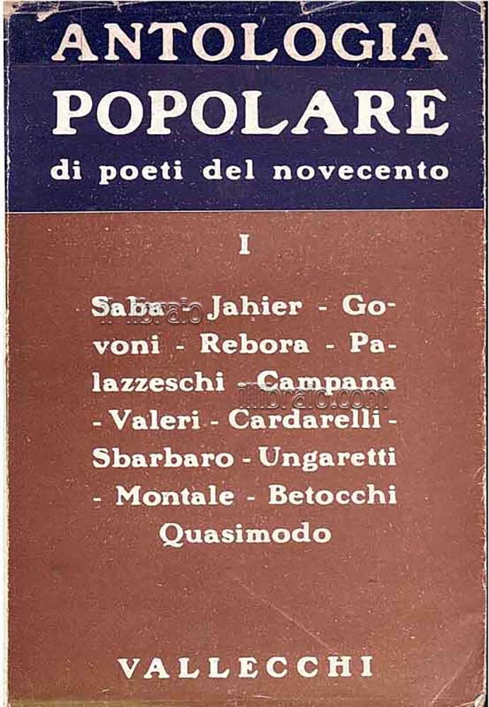 in 16°; pp. 304; br. con sovracop. Volume I: Saba, Jahier, Govoni, Rebora, Palazzeschi, Campana, Valeri, Cardarelli, Sbarbaro, Ungaretti, Montale, Betocchi e Quasimodo