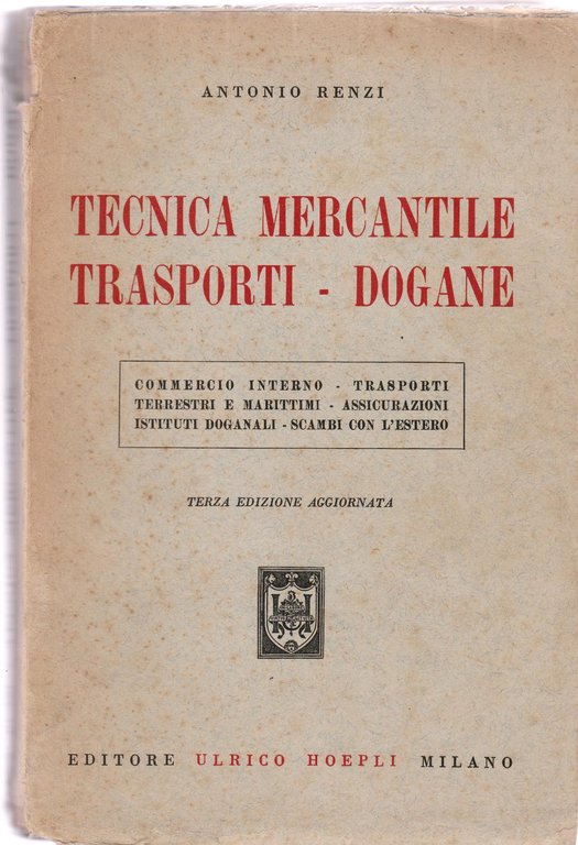 ANTONIO RENZI TECNICA MERCANTILE TRASPORTI DOGANE COMMERCIO INTERNO TRASPORTI TERRESTRI E MARITTIMI ASSICURAZIONI ISTITUTI DOGANALI SCAMBI CON L'ESTERO III EDIZIONE AGGIORNATA EDITORE ULRICO HOEPLI MILANO 1956 6089 COPERTINA MORBIDA EDITORIALE CON ALONI E LIEVI FIORITURE AI PIATTI DORSO CON MANCANZE AI MARGINI UN NUMERO SCRITTO A PENNA ALL'ANGOLO SUPERIORE DELLA QUARTA DI COPERTINA TAGLI IRREGOLARI COPERTINA LEGGERMENTE STACCATA DAL LIBRO FOGLI DI GUARDIA CON ALONI INTERNO CON LEGGERI ALONI ALLE PAGINE E LIEVE INGIALLIMENTO AI MARGINI NUMERO PAGINE 398 DIMENSIONI CM 23 X 15,3