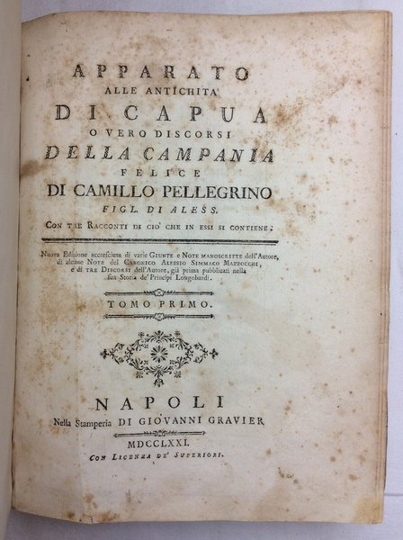In-8 (mm. 232x178), 2 volumi, p. pergamena coeva, fregi e titolo oro su due tasselli al dorso, pp. XLII,496,(2 di errata); VII,352,38; con lo stemma della città di Capua e 2 carte inc. in rame e più volte ripieg. fuori testo: una geografica della Campania ed una con la pianta della città di Capua. In Appendice tre discorsi: 1° Dell'origine dell'antica famiglia detta di Colimenta - 2° D'un antico significato del nome Porta - 3° Dell'antico sito di Capua. ...