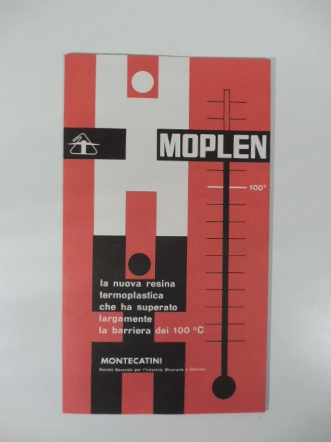 Pieghevole di 8 facciate (ciascuna misura cm 12 x 21). Pieghevole pubblicitario del Moplen, materiale che rivoluziono' l'industria dei materiali termpolastici. Il polipropilene isotattico fu scoperto negli anni cinquanta dal chimico imperiese Giulio Natta. L'invenzione valse a Natta il Premio Nobel per la chimica del 1963. Il Moplen era prodotto dalla Polymer e dalla Montesud (controllate della Montecatini, poi Montedison).