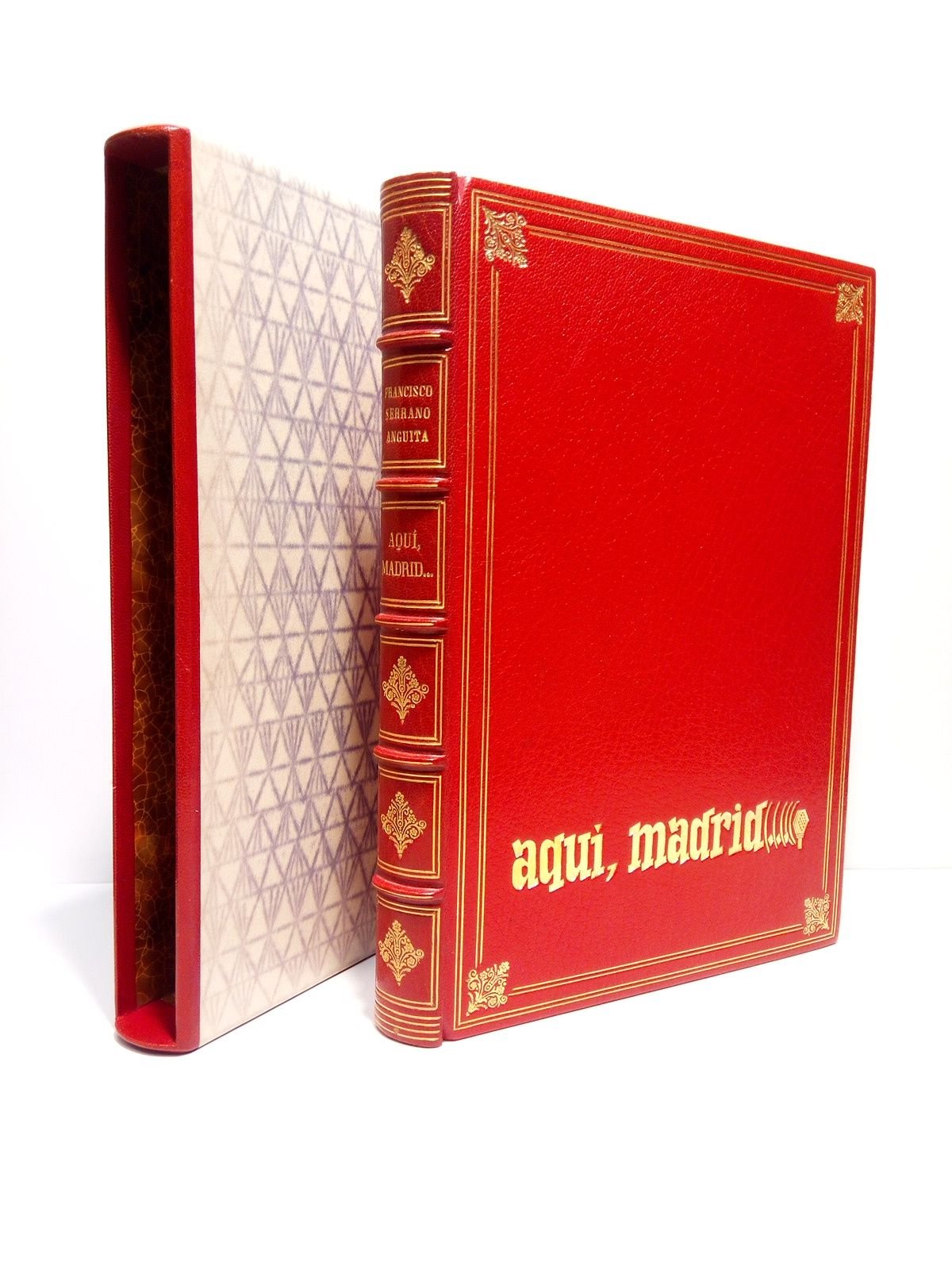 EDICION DE LUJO.- Madrid: Ayuntamiento de Madrid (Imp. Artes Gráficas Municipales), 1968.- 273 p., [1 h.] + 2 en blanco: Ante la pag. 9, retrato fotográfico de Serrano Anguita en negro ya toda plana; 4º (24,7 x 17,4 cm); Magnífica encuadernación en Plena Piel marroquén, lomo bellamente dorado, tapas o planos con cuatro filetes recuadrando y hierro dorado en las esquinas y título de la obra estampado en oro, cantos con filete dorado y contracantos con rueda dorada y filetes dorados recuadrando, guardas de gran calidad pintadas al engrudo sobre papel verjurado, cortes dorados, estuche, conserva la cubierta anterior original ilustrada con una bella acuarela de "Vilarroig".- RARISIMO EJEMPLAR.* Excelente estado. Sin duda un ejemplar de los que se encuadernaron especialmente para obsequiar a las autoridades. Aunque no va firmada, por su técnica, la encuadernación está sin duda ejecutada por un gran maestro encuadernador, posiblemente por algun discípulo de Antolín Palomino de la Imprenta Municipal. MADRID