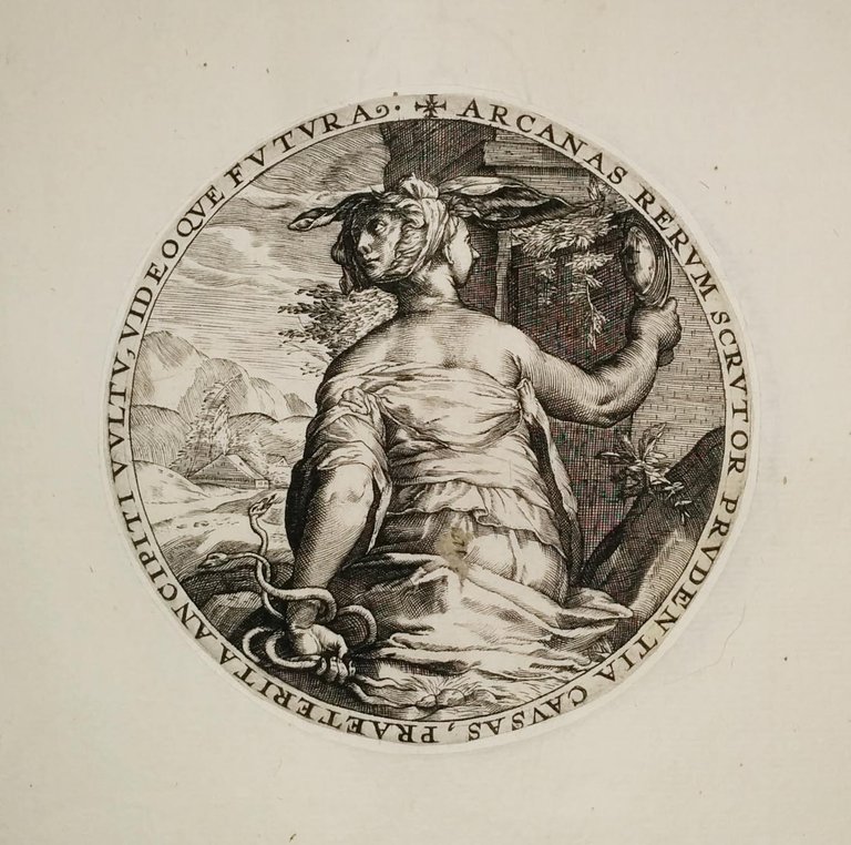 >Incisione in rame (entro tondo) cm 10, raffigurante una donna bifronte che si specchia, mentre nell'altra mano ha due serpi. Allegoria della Prudenza.