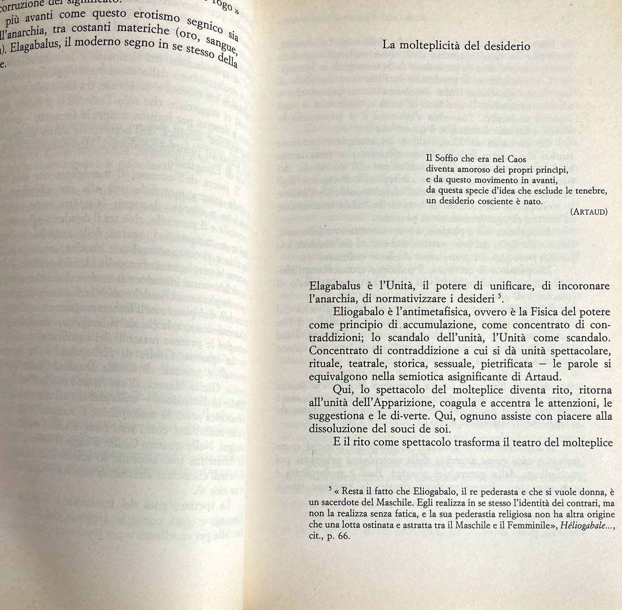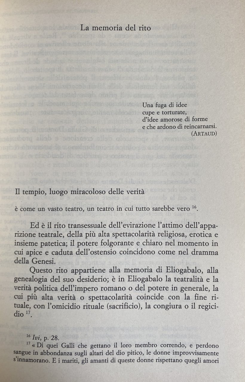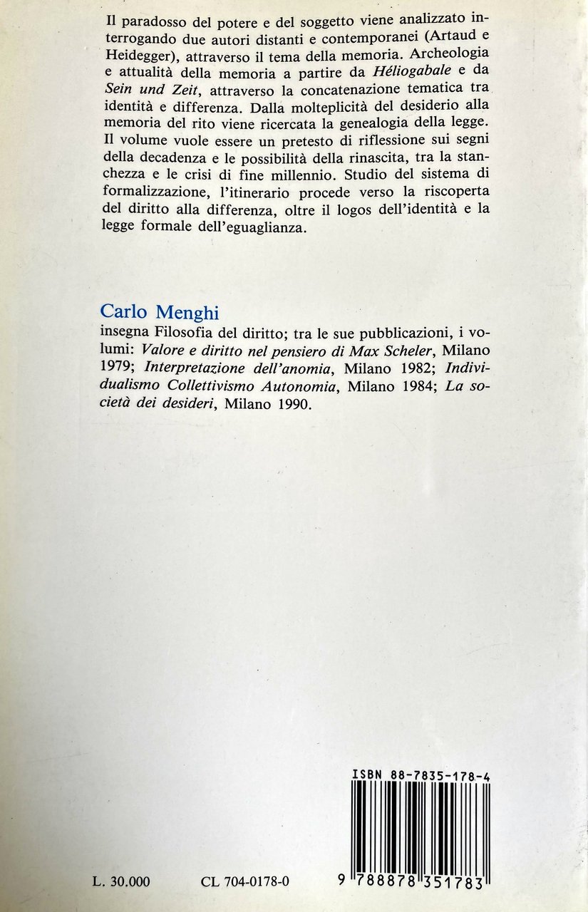 Il paradosso del potere e del soggetto viene analizzato interrogando due autori distanti e contemporanei (Artaud e Heidegger), attraverso il tema della memoria. Archeologia e attualità della memoria a partire da Héliogabale e da Sein und Zeit, attraverso la concatenazione tematica tra identità e differenza. Dalla molteplicità del desiderio alla memoria del rito viene ricercata la genealogia della legge. Il volume vuole essere un pretesto di riflessione sui segni della decadenza e le possibilità della rinascita, tra la stanchezza e le crisi di fine millennio. Studio del sistema di formalizzazione, l'itinerario procede verso la riscoperta del diritto alla differenza, oltre il logos dell'identità e la legge formale dell'eguaglianza.