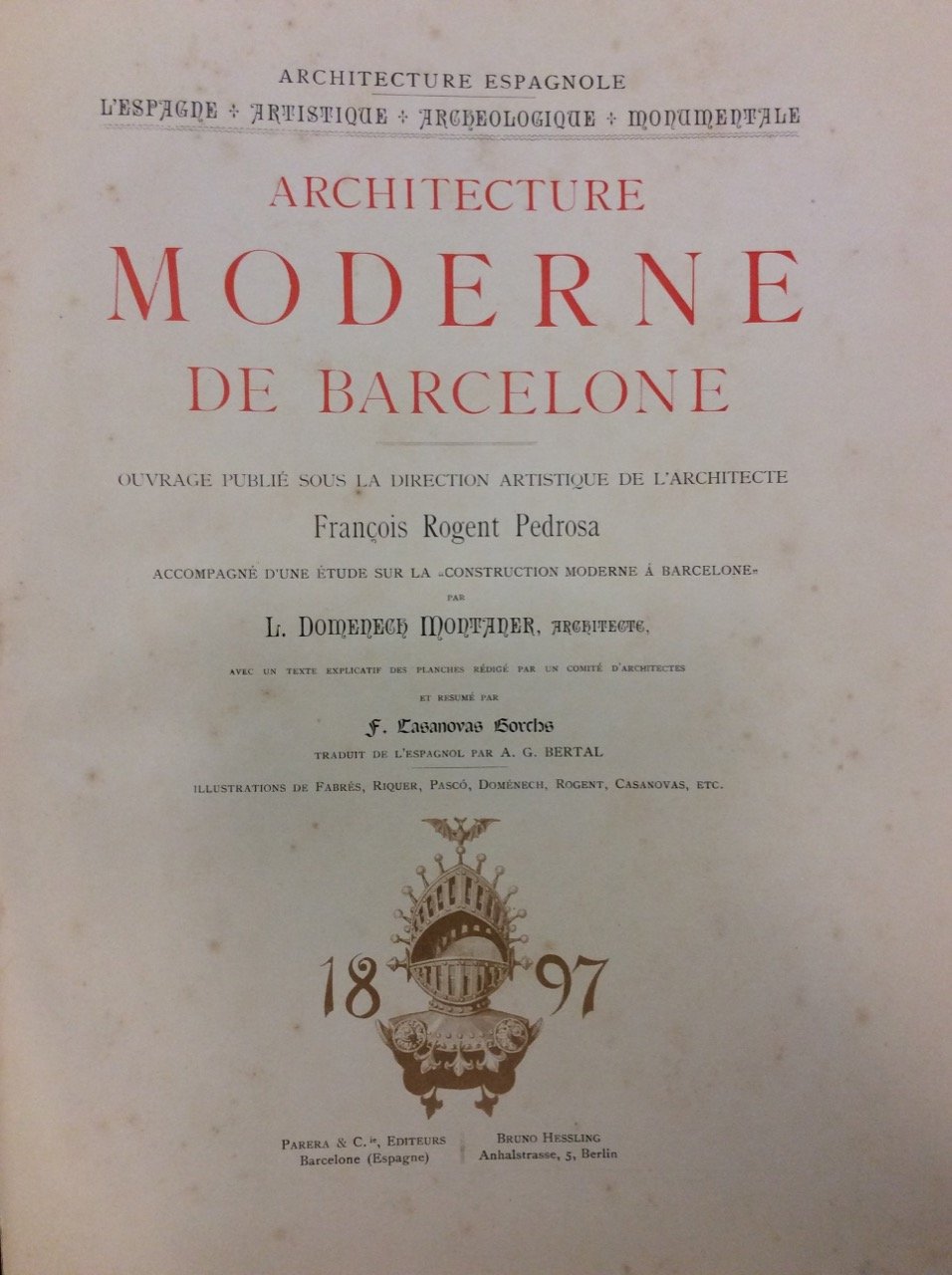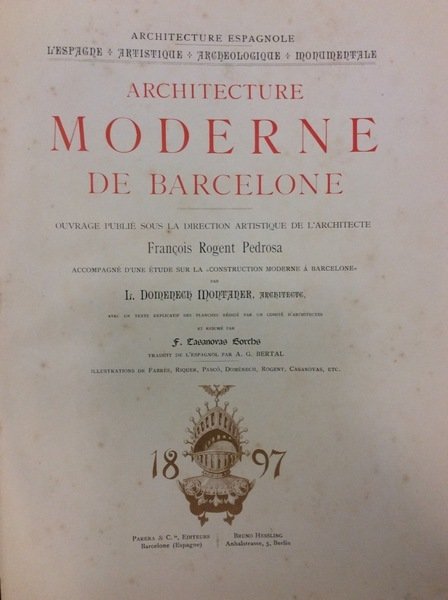 In-folio (mm. 400x272), tela editoriale, pp. (4),74, molto ben illustrato in bianco e nero nel testo (foto e disegni) e da 36 tavole fotografiche in bianco e nero, fuori testo, con didascalia. L'opera è accompagné d'une étude sur la Construction moderne á Barcelone' par L. Domenech Montaner, avec un texte explicatif des planches, rédigé par un comité d'architectes, et resumé par F. Casanovas Gorchs. Traduit de l'espagnol par A. G. Bertal. Illustrations de Fabrés, Riquer, Pasco, Doménech, Rogent, Casanovas, etc. Volume della Collana 'Architecture Espagnole. L'Espagne artistique, archeologique, monumentale. Solo qualche lieviss. fioritura, altrimenti esemplare ben conservato.