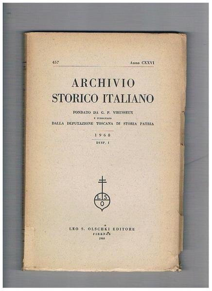 Archivio storico italiano, trimestrale fondato da G. P. Viesseux. Anno 1968 disp. n° 1. Contiene: i confini della diocesi ecclesiastica del municipio romano e dello sttao etrusco di Volterra; note di storia della religiosità e della carità dei fiorentini nel secolo XVI°; ecc.