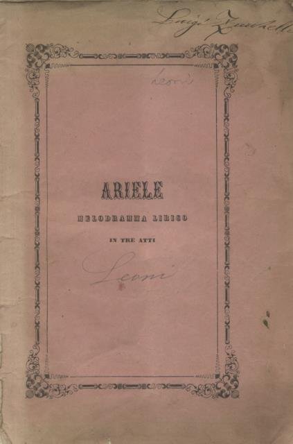 ARIELE (1855). Melodramma lirico in tre atti di G. Sacchero da rappresentarsi nel Teatro dell'Accademia dei Filodrammatici di Milano nel Giugno 1855. Libretto d'Opera.