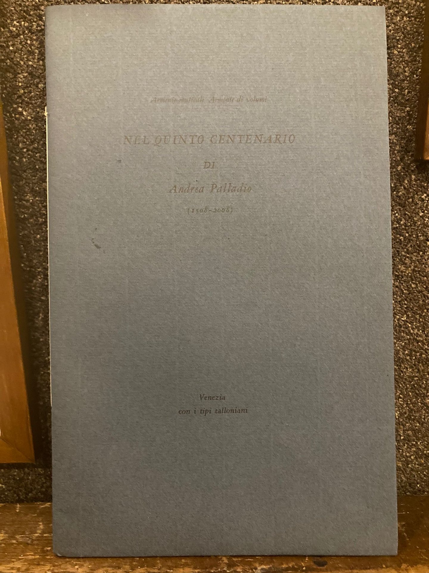 In-4° (29x18 cm), pp. (16), brossura editoriale incamiciata azzurra con titoli in nero al piatto anteriore. Ottimo esemplare (n° 59/333) su carta di Sicilia composto a mano con i corsivi palladiani disegnati da A. Tallone, incisi a Parigi da Ch. Malin, fusi in corpo 12 e con i caratteri rinascimentali Garamond corpo 10. Non comune pubblicazione della serata musicale celebrativa palladiana svoltasi all' Ateneo lagunare il 1 dicembre 2008. Come incipit stampato stralcio delle Vite del Vasari dedicato a Palladio (dall' edizione Stecchi-Pagani, 1772)
