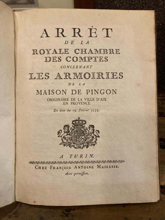 Arrêt de la Royale chambre des comptes concernant les armoires de la Maison de Pingon originaire de la ville d'Aix en Provence en date du 19. Janvier 1779
