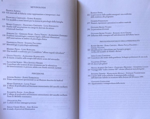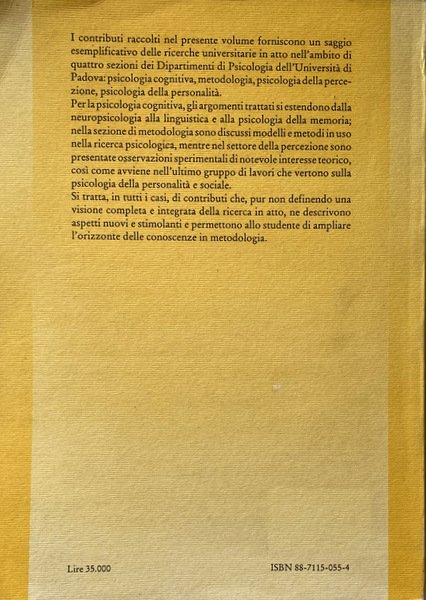 I contributi raccolti in questo volume spaziano dalla psicologia cognitiva alla metodologia, dalla psicologia della percezione alla psicologia della personalità. Gli argomenti di psicologia cognitiva riguardano argomenti che vanno dalla neuropsicologia alla linguistica, alla psicologia della memoria; nell'ambito della metodologia sono discussi modelli e metodi in uso nella ricerca psicologica, mentre nel settore della percezione sono presentate interessanti osservazioni sperimentali, così come nei lavori che vertono sulla psicologia della personalità e sociale.