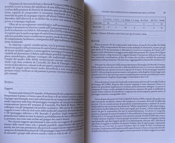 Soggetti: Psicologia cognitiva, Metodologia, Percezione, Personalità, Studi in onore, Opere generali, Scienze sociali, Socializzazione, Ricerche, Congressi, Convegni, Ricerca sperimentale, Neuropsicologia, Atti, Papers, Scritti vari, Medicina, Logopedia, Educazione, Percezione, Mitologia, Marketing, Dinamiche relazionali di gruppo, Relazioni sociali, Comprensione dei testi, Apprendimento, Sviluppo cognitivo, Metodologia, Tecniche, Test sperimentali, Esperimenti, Linguistica, Segni, Semantica, Linguaggio, Influenze culturali, Elaborazione, Pensiero, Comportamento, Scienze cognitive, Logografia, Logica, Lettura, Leggere, Partecipazione politica, Cartelli pubblicitari, Liste, Errori semantici, Alfabeto, Parole, Fiducia, Elezioni, Elettorato, Analisi elettorali, Appartenenza, Identificazione, Morte, Lutto, Conoscenza, Memoria, Scrittura, Libri Rari Vintage Fuori catalogo, Saggistica, Misurazioni, Variabili psicologiche, Disegno, Tecnica, Analisi psicometrica, Teorie, Modelli, Studi clinici, Dati, Fodor, Shallice, Deficit, Lesioni cerebrali, Malattie, Pazienti, Dissociazioni mentali, Dissociazione, Danno neurologico, Neuroni, Cervello, Afasia, Broca, Wernicke, Prestazioni, Disabilità, Bairon, Treiman, Ehri, Prove, Test, Cornoldi, Cattivi/buoni lettori, Pazzagli, De Beni, Cristante, Yuill, Parkin, Oakhill, Stanchezza, Gruppi, Risposte, Risultati, Interpretazione, E.H. Erikson, E. Berne, Freud, W.R. Bion, A. Imbasciati, Melanie Klein, Famiglia, Ambiente sociale, Patologia infantile, Collettivismo, Orientamento Relazionale, R. Brown, J. Cohen, R. Ellemers, S. Hinkle, L.S. Aiken, Colori, Colore postumo, Hurvich, Zeki, Boynton, Zigler, Ritardo mentale, Alzheimer, Fenner, Hewitt, Nadel, Epstein, Tampieri, Soresi, Vianello, Balla, Hodapp, Zanforlin, Tomat, Cancello oscillante, LISREL, G.R. Loftus, Masson, Weiss, Embretson, Relazioni familiari, Conflittualità, Infarto, Dolore, Sintomi, Disagio, ANOVA, Sindrome di Down, Bibliografia, Riferimento, Consultazione, Punteggio, Valutazione, Statistica, Locus of Control, Modelli, Desiderabilità, Bambini, Gioco, Ansia, Segnali ridondanti, Associazioni, Tempo di decisione, Ritardo evitabile, Weilgosz, Goldstein, Arvelier, Castillo, Takano, Moss, Sainsous, Rawlins, Hackett, Schroeder, Età, Ambulanza, Soccorsi, QRDM, Deterioramento mentale, Autonomia, Scale, Cognitive psychology, Methodology, Perception, Personality, Honor studies, General works, Social sciences, Socialization, Researches, Congresses, Conferences, Experimental research, Neuropsychology, Proceedings, Papers, Various writings, Medicine, Speech therapy, Education, Perception, Mythology, Dynamics Group relational, Social relations, Reading comprehension, Learning, Cognitive development, Methodology, Techniques, Experimental tests, Experiments, Linguistics, Signs, Semantics, Language, Cultural influences, Processing, Thinking, Behavior, Cognitive sciences, Logography, Logopedia, Logic, Reading, Political participation, Advertising signs, Lists, Semantic errors, Alphabet, Words, Trust, Elections, Electorate, Electoral analysis, Membership, Identification, Death, Mourning, Knowledge, Memory, Writing, Rare books out of print, Non-fiction, Measurements, Psychological variables, Design, Technique, Psychometric analysis, Theories, Latent traits, Models, Clinical studies, Data, Injury Diseases, Patients, Mental dissociations, Neurological damage, Neurons, Brain, Aphasia, Performance, Disability, Evidence, Bad/good readers, Tiredness, Groups, Responses, Results, Interpretation, Family, Social environment, Childhood pathology, Collectivism, Relational Orientation, Posthumous Colors, Mental Retardation, Swing Gate, Family Relations, Conflict, Heart Attack, Pain, Symptoms, Discomfort, Down Syndrome, Bibliography, Reference, Consultation, Score, Evaluation, Statistics, Models, Desirability, Children, Game, Anxiety, Redundant signals, Associations, Decision time, Avoidable delay, Age, Ambulance, Aid, Mental deterioration, Autonomy, Scales