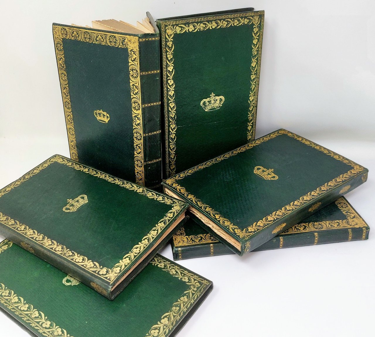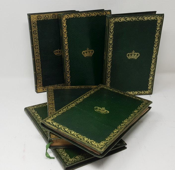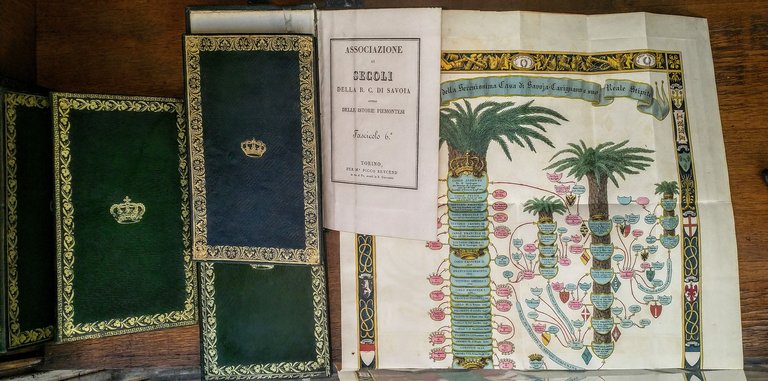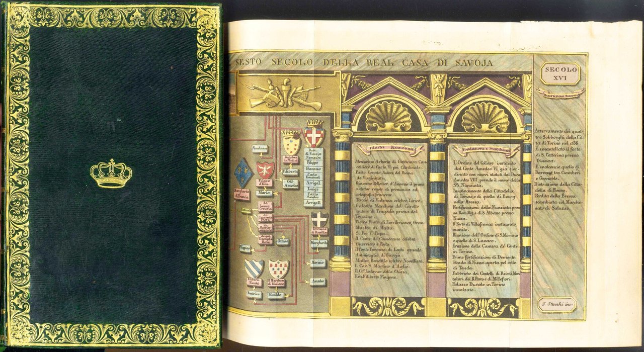 >6 volumi in-4 (mm 216x138), paginazione continua per i primi 4 volumi pp. 1-469 (precedute da 8, con Proemio dell'editore) e pp. 1-310 per i volumi 5 e 6. Una sorta di occhietto stampato su carta più pesante di colori differenti precede il testo, che è seguito da concessione di stampa e da una tavola più volte ripiegata f.t. in fine: Tavola genealogica statistica e cronologica dal primo al sesto secolo della Reale Casa di Savoia. Le 6 tavole, incise all'acquatinta da Stucchi e stampate in bistro sono in questo esemplare magnificamente colorate, graficamente assai elaborate, ricche di cartigli, colonne, stemmi e vedutine; l'autore avverte che ''i rami, insieme collegati, potranno divenire il soggetto di una carta generale, storico-genealogica, statistica e cronologica, del nostro paese''. Sei belle legature coeve di Felice Albinolo realizzate per Carlo Alberto di Savoia-Carignano: in pieno marocchino verde a grana incrociata; ai piatti riquadro di filetti e due elaborate bordure con fiori e fogliame, al centro grande corona, che varia (volumi I-IV ducale; volumi V-VI regale), così come i dorsi lisci con titolo su tassello verde, data e decorazione variata negli scomparti, con, fiori, greche, ghiande. I tagli, inusualmente in una rilegatura di lusso, furono lasciati in barbe e non rifilati né dorati. Nell'esemplare conservato alla Biblioteca Reale, sul verso della carta di guardia anteriore del solo I volume compare l'indirizzo del rilegatore Felice Albinolo, nel nostro in tutti. Uno dei pochi esemplari appositamente impressi su carta grande e forte e miniati per il principe e la corte e venduti a fascicoli in Associazione. La pregevole legatura fu eseguita per Carlo Alberto - come riporta il timbro con suo blasone apposto al verso del risguardo anteriore - dal "Legatore da Libri di S. A. S. il Sig. Principe di Carignano e fabbricante di pelli e carte marmorate e marocchinate con Privilegio di S.S.R.M." : Felice Albinolo fu tra i più raffinati legatori piemontesi, lavorò per il futuro Re e tra gli altri per i Caissotti di Chiusano. Il Paroletti (1765-1834), Segretario Generale del Governo Provvisorio nel 1799, fu Deputato del Dipartimento del Po al Corpo Legislativo di Parigi, e membro dell'Accademia delle Scienze.