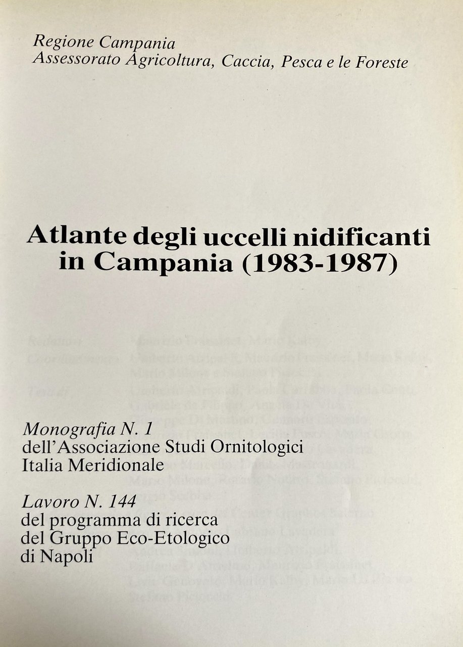 - Ornitologia, Fauna, Agricoltura, Caccia, Pesca, Foreste, Zoologia, Naturalisti, Uccelli, Atlanti, Natura, Ecologia, Atlante, Atlante ornitologico, Elenchi, Animali selvatici, Specie ornitiche, Nidificanti, Geografia, Etologia, Dati, Inanellamento, Anni Ottanta, Libri rari, Libri illutrati, Libri fuori catalogo, Collezionismo, Scienze, Studi Ornitologici, Italia Meridionale, Lista Rossa, Biologia, Biodiversità, Clima, Ecosistema