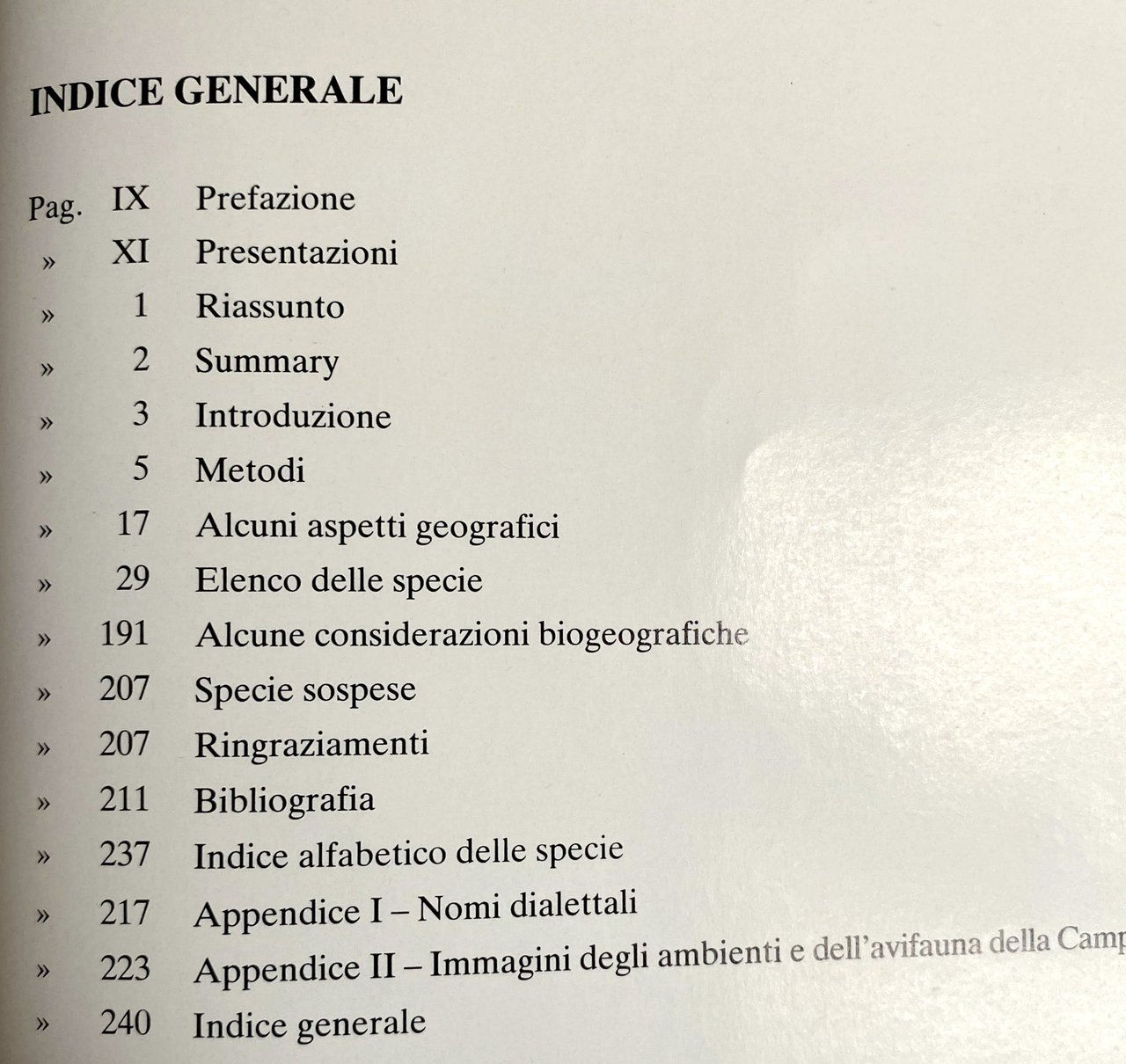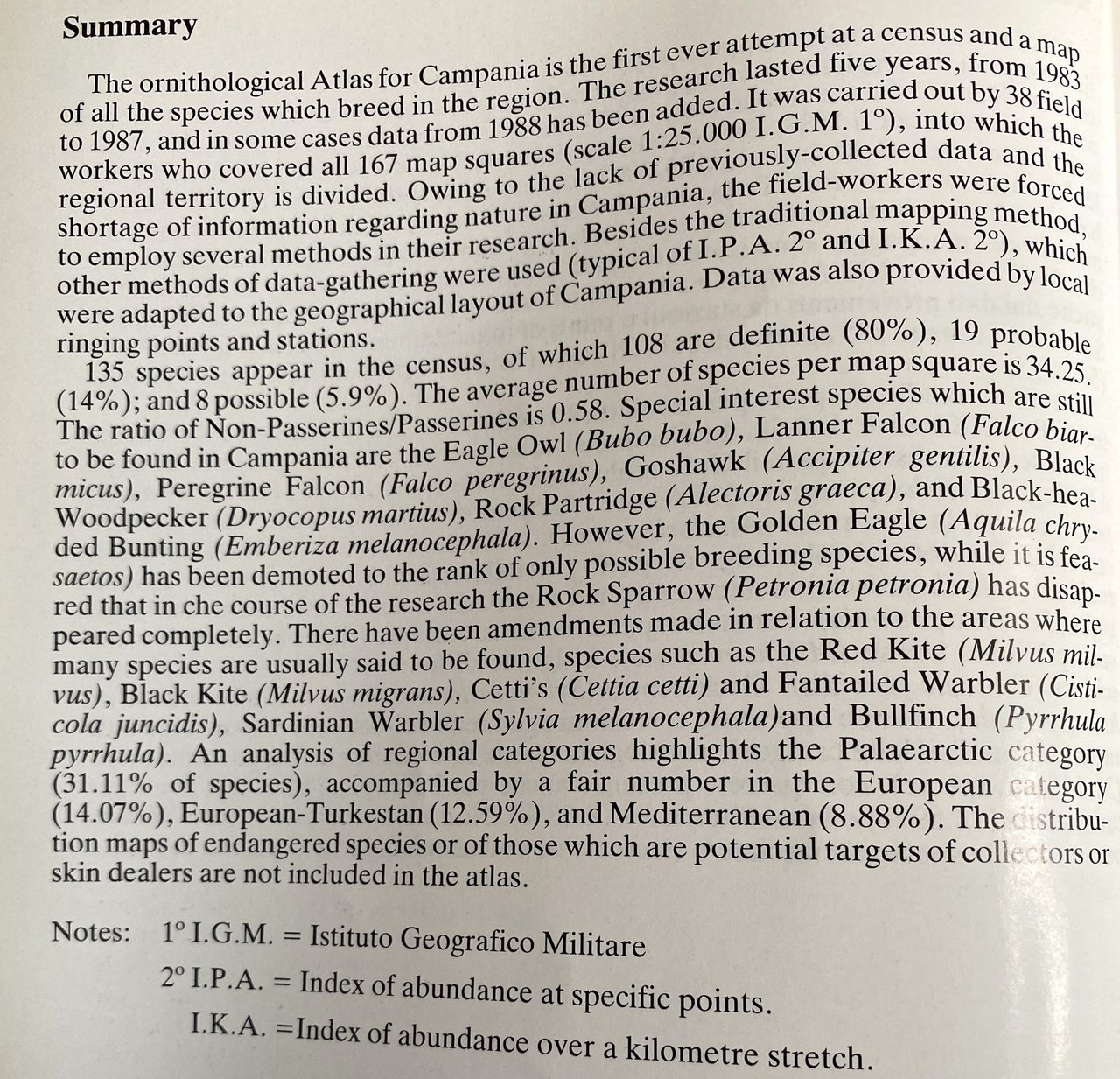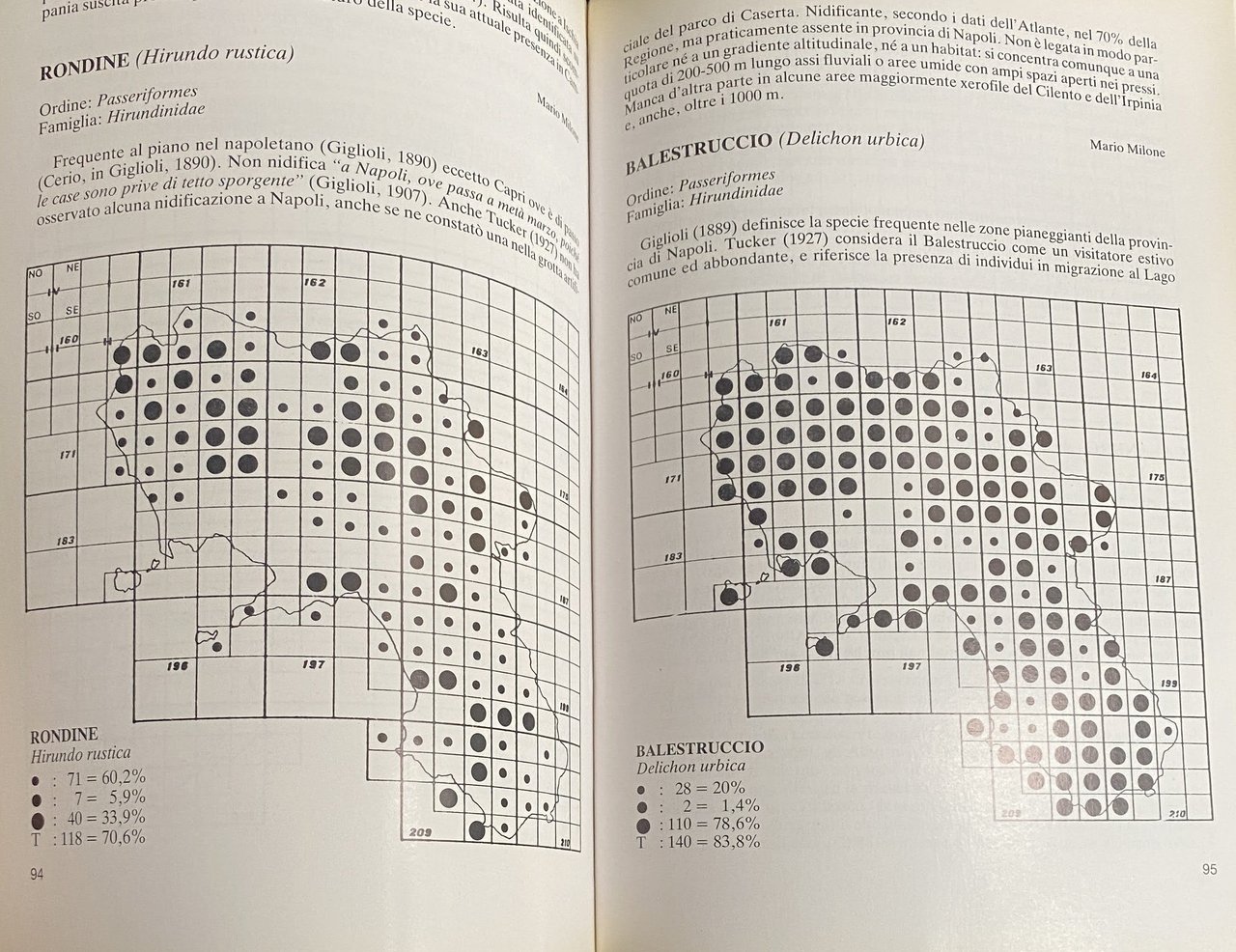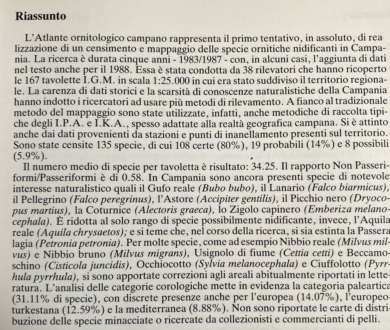 Soggetti: Ornitologia Fauna Agricoltura Caccia Pesca Foreste Zoologia Naturalisti W.W.F. Uccelli Atlanti Natura Ecologia Protezione Atlante ornitologico campano Censimento Mappaggio Mappatura Elenchi Animali selvatici Specie ornitiche nidificanti Territorio Rilevamento I.P.A. I.K.A. Geografia Dati Stazioni Inanellamento Non Passeriformi Gufo Bubo Lanario Falco biarmicus Pellegrino peregrinus Astore Accipiter gentilis Picchio nero Dryocopus martius Coturnice Alectoris graeca Zigolo capinero Emberiza Nidificante Aquila chrysaetos Estinzione lagia Petronia Nibbio Milvus bruno Migrans Usignolo di fiume Cettia cetti Beccamoschino Cisticola juncidis Occhiocotto Sylvia melanocephala Ciuffolotto Pyrrhula Letteratura sceintifica Studi Ricerche Analisi Categorie corologiche Paleartica Europea Turkestana Mediterranea Distribuzione Minacciate Collezionisti Vommercianti Pelli Cacciatori Forestale Ambiente Census Passerines Eagle Owl Lanner Falcon Peregrine Goshawk Black Woodpecker Rock Partridge Black-headed Bunting Golden Demoted Rank Breeding species Sparrow Disappeared Amendments Areas Red Kite Cetti's Fantailed Warbler Sardinian Bullfinch Highlights Palaearctic European category Mediterranean Distribution maps Endangered Targets Collectors Skin dealers Atlas LIPU Irpinia Matese Cilento Sannio Svasso maggiore Tarabusino Germano reale Barbagianni Assiolo Civetta Allocco comune Succiacapre Rondone pallido Sparviere Poiana Martin pescatore Grillaio Gheppio Gruccione Lodolaio Upupa Torcicollo verde rosso Starna mezzano minore Quaglia Fagiano Calandra Porciglione Calandrella Gallinella d'acqua Folaga Cappellaccia Tottavilla Corriere Allodola Gabbiano Piro Topino Rondine montana Piccione selvatico Colombella Cuculo Colombaccio Tortora dal collare orientale Balestruccio Calandro Prispolone Spioncello Cutrettola Ballerina gialla bianca Merlo acquaiolo Scricciolo Pigliamosche Balia Codibugnolo Cincia bigia mora Cinciarella Passera scopaiola Cinciallegra Sordone muratore Pettirosso Check-list Rampichino spazzacamino Pendolino Rigogolo Averla piccola Stiaccino Cenerina Saltimpalo Culbianco Capirossa Monachella Ghiandaia Gazza Codirossone Passero solitario Tordo bottaccio Tordela corallino Taccola grigia Corvo imperiale Forapaglie castagnolo Cannaiola Cannareccione Canapino Magnanina Sardegna Sterpazzolina grossa Sterpazzola Capinera Lui bianco Fiorrancino Storno Mattugia Fringuello Verzellino Verdone Cardellino Fanello Frosone giallo muciatto Strillozzo Anni Ottanta Libri rari illutrati fuori catalogo Collezionismo Scienze Studi Ornitologici Italia Meridionale Lista Rossa ASOIM Atòanti Biologia Biologico Biodiversità Endemismo Distribuzion Vegetali Tempi Variazioni Comunità biologiche Cambiamenti Clima Ecosistema Conservazione Indicatori ambientali Pianificazione Impatto Migrazioni Flora Densità Indici Antropiche Alterazioni Inquinamento Scomparsa Comparsa Equilibrio Gibbons Riconoscimento Svernanti invernale Primavera Piciformi Strigiformi Febbraio Riproduzione Rituali riproduttivi Richiamo sessuale Difesa territoriale Estate Autunno Habitat Maschio Canto Stagione riproduttiva Femmina Coppia Comportamento Corteggiamento Nido Incubatrice Scavo Nidi Abbandono Giovani Involati Adulti Incubazione Sacca fecale Cibo Uova Visite Versi Canti Anseriformi Galliformi Gruiformi Podicipediformi Caradriformi Accipitriformi Coraciformi Falconiformi Gracchio Conteggio Raccolta Informazioni Misurazioni Osservazioni Donald Bauer Fornasari Dawson Avian Evolution Norris Perring Walters Botanical Appassionati Bird-watching Citizen Meschini Frugis Selvaggina Lardelli Bogliani Brichetti Caprio Celada Conca Fraticelli Gustin Janni Pedrini Puglisi Rubolini Ruggieri Spina Tinarelli Calvi Brambilla Martorelli Harrison Giglioli Resoconto avifaunistico Gabbiani Antropizzazione Parchi Riserve naturali Astroni Oasi Volturno Escursioni alare Geologia Acque Acquiferi Alburni Appennini Vulcaniche Attività Bussento Calore Irpino Campi Flegrei Caserta Celico Costiera Ischia Golfo Grotta Macchia Marina Monte Parco Picentini Pietraroia Salerno Sele Spiaggia Tirreno Vulcano Zona Vesuvio Wildlife Colonie Avvistamenti Avifauna Larry Harris Avellino Serino Garigliano Taburno Partenio Monti Lattari Camaldoli Epomeo Cervialto Marzano Avella Sant'Angelo Tre Pizzi Miletto Sella di Conza Gelbison Baiano Lauro Valle Caudina Alento Vallo di Diano Sarno Massico Pignatti La Valva Arrigoni degli Oddi Bibliografia Riferimento Tucker Costa Salvadori Voous Carta altimetrica Procida Capri A'rpegna Pulicinella Dialetto napoletano Nomi Sparviero Cristariello Quagghia Pernice Uocchio cuotto Palummella Tortorella Palummo Facciommo Rennenone Luppeca Monnezzara Pappamosca Chiummarella Mettempunte Monacella Sammartino Codejanco Cornacchia Frungillo Cardillo Tanagro Cratere Boschi Bosco Ornithology Agriculture Hunting Fishing Forests Zoology Naturalists Birds Atlases Nature Ecology Protection Campanian ornithological atlas Mapping Lists Wild animals Nesting Territory Survey Geography Data Stations Ringing Scientific literature Studies Research Analysis Chorological categories Palearctic Turkestan Threatened Traders Skins Hunters Forestry Environment Great Crested Grebe bittern Mallard Barn Scops Tawny Nightjar Pallid swift Sparrowhawk Buzzard Kingfisher Lesser Kestrel Bee-eater Hoopoe Wryneck Green Pilgrim Quail Pheasant water rail Moorhen Coot Lark Woodlark Ringed plover Skylark Seagull Sandpiper Crag dove Stock dove Cuckoo Wood Pigeon Collared Dove House Pipit Tree Yellow Wagtail White Wren Flycatcher Long-tailed Coal Blue Dunnbird Tit Nuthatch Robin Penduline Eurasian Oriole Redstart backed Shrike Whinchat Little Stonechat Northern Wheatear Jay Magpie Blackbird Song Mistle Thrush Red-throated Jackdaw Crow Common Raven Chestnut Reed Dartford Subalpine Whitethroat Firecrest Starling Treefrog Chaffinch Serin Greenfinch Goldfinch Linnet Hawfinch Yellowhammer Black-capped Corn Rare illustrated books out of print Collecting Science Southern Italy List Biology Biologic