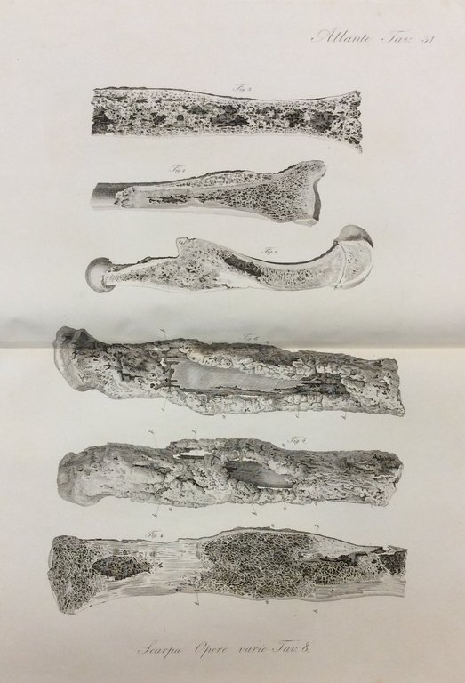 Cm. 39 x 27,5, mz. tela coeva (picc. manc. al dorso; abrasioni ai piatti in cartonato). L'Atlante contiene complessive 73 pregevoli tavole litografate, ciasc. con più figure, a doppia pagina, (54 in chiaro-scuro + 19 bis al tratto), così suddivise:<br>- Malattie degli occhi, tav. unica con 30 figg.<br>- Ernie, con 24 tavole di cui 11 ripetute al tratto<br>- Aneurisma, con 11 tavole di cui 1 bis, inc. in rame, che raffigura strumenti.<br>- Opere varie con 36 tavole di cui 8 ripetute al tratto, inc. in rame.<br>- Appendice con 1 tav. che raffigura un elmo cesellato.Si uniscono 6 tavole, pure inc. in rame, tratte dalle Opere varie. "Mancano" le pp. di spiegazione delle tavole. Esemplare con macchie su sole due tavole, altrimenti ben conservato.