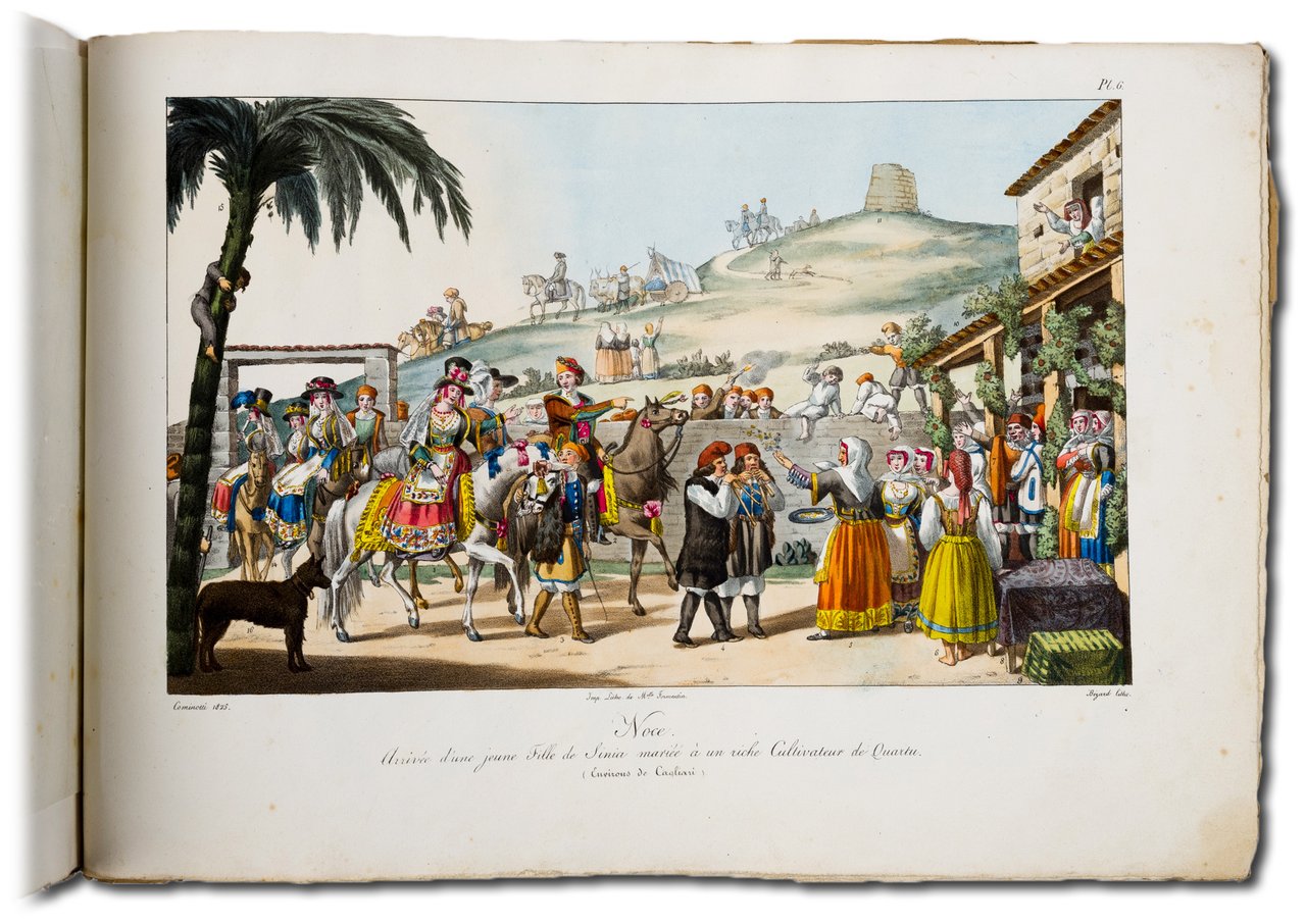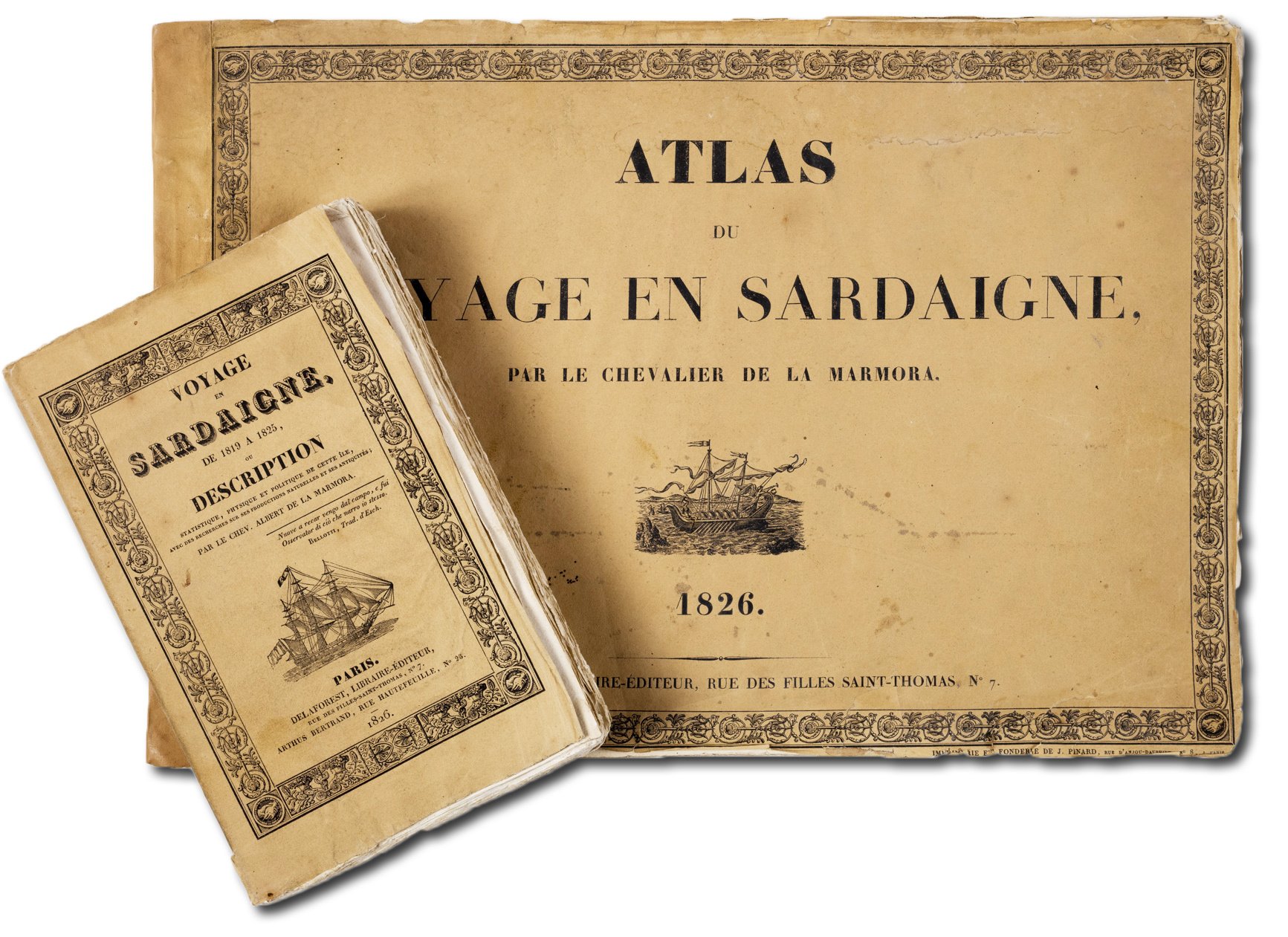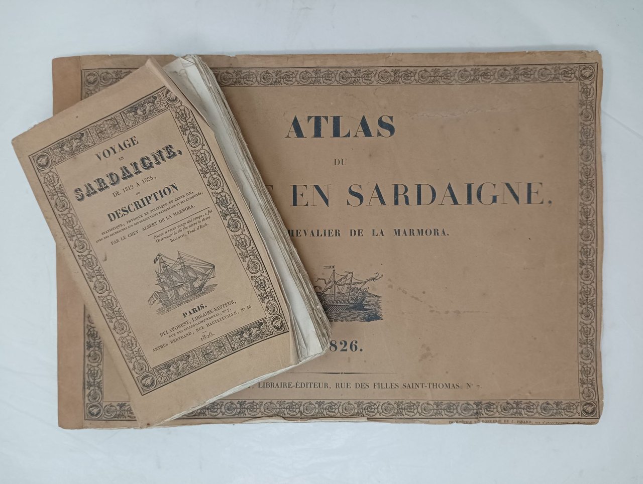 >2 volumi: un volume di testo in-8 ed un atlante in-folio oblungo (mm 295x430), entrambi in brochure editoriale con titoli e vignette ai piatti (rifatto il dorso dell'album). Prima edizione, rara a reperirsi completa dei due tomi. Il volume di testo (pp. IX, 511) è illustrato da un bell'antiporta, litogr. da Roberto d'Azeglio dal disegno del Cominotti e colorato a mano, raffig. l'autore in veste di esploratore accompagnato dagli strumenti necessari alle sue ricerche, e da una tavola a colori, degli stessi artisti, raffig. il «molentu», tipico mulino azionato da un mulo; 3 tabelle statistiche ripieg. f.t. Comprende una sintesi della storia sarda dalle origini leggendarie alle dominazioni cartaginese e romana, alle invasioni barbariche e arabe, all'occupazione aragonese sino all'amministrazione piemontese, meticolosamente esaminata dal punto di vista economico, sociale e culturale; segue una descrizione fisica, naturalistica e statistica dell'isola. Raccoglie inoltre le osservazioni in campo etnografico che il La Marmora (1789-1863), esiliato dopo i moti del '21 nell'isola ed ivi trattenuto più tardi dal governo piemontese con incarichi militari, ebbe occasione di fare durante circa 16 anni. L'Atlante comprende una carta dell'isola, 6 grandi tabelle in litografia dei Giudici delle 4 province e di Osservazioni metereologiche e 7 belle animate tavole di costumi e usanze popolari, litografate e vivacemente dipinte all'epoca, con titoli in francese (Miliziani, Aratri e carri, Tavola doppia di costumi, Ballo sardo, Festa campestre a Quartu, Festa di Nozze, Attito a Tempio). Buon esemplare. Piloni, Sardegna. nelle incisioni, 648-55 e tav. LVII- LXX. Poggendorff I, 1355; Brunet III, 785 .