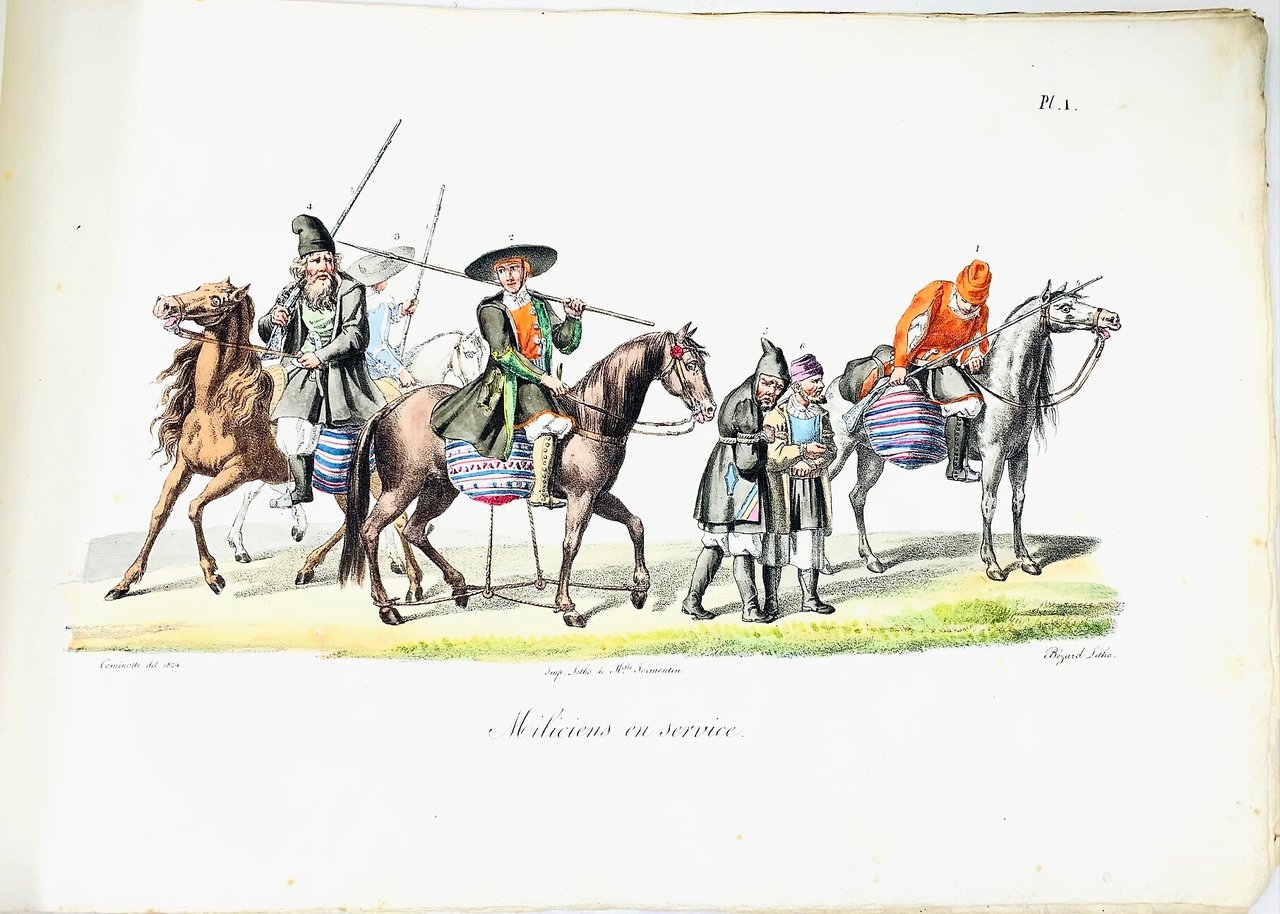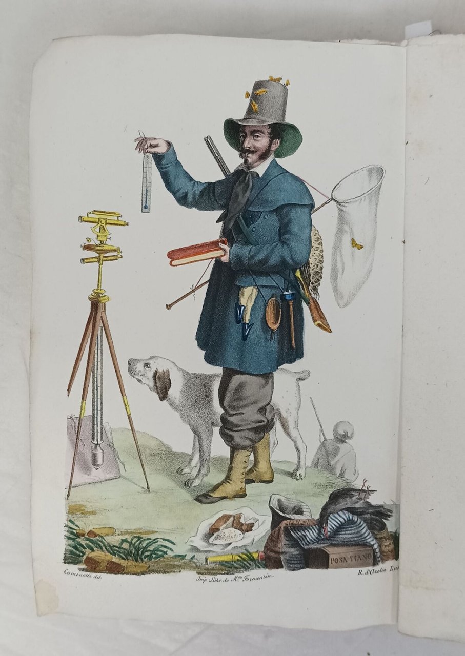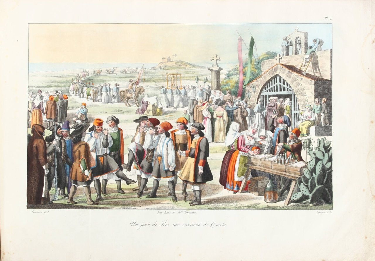>2 volumi: un volume di testo in-8 ed un atlante in-folio oblungo (mm 295x430), entrambi in brochure editoriale con titoli e vignette ai piatti (rifatto il dorso dell'album). Prima edizione, rara a reperirsi completa dei due tomi. Il volume di testo (pp. IX, 511) è illustrato da un bell'antiporta, litogr. da Roberto d'Azeglio dal disegno del Cominotti e colorato a mano, raffig. l'autore in veste di esploratore accompagnato dagli strumenti necessari alle sue ricerche, e da una tavola a colori, degli stessi artisti, raffig. il «molentu», tipico mulino azionato da un mulo; 3 tabelle statistiche ripieg. f.t. Comprende una sintesi della storia sarda dalle origini leggendarie alle dominazioni cartaginese e romana, alle invasioni barbariche e arabe, all'occupazione aragonese sino all'amministrazione piemontese, meticolosamente esaminata dal punto di vista economico, sociale e culturale; segue una descrizione fisica, naturalistica e statistica dell'isola. Raccoglie inoltre le osservazioni in campo etnografico che il La Marmora (1789-1863), esiliato dopo i moti del '21 nell'isola ed ivi trattenuto più tardi dal governo piemontese con incarichi militari, ebbe occasione di fare durante circa 16 anni. L'Atlante comprende una carta dell'isola, 6 grandi tabelle in litografia dei Giudici delle 4 province e di Osservazioni metereologiche e 7 belle animate tavole di costumi e usanze popolari, litografate e vivacemente dipinte all'epoca, con titoli in francese (Miliziani, Aratri e carri, Tavola doppia di costumi, Ballo sardo, Festa campestre a Quartu, Festa di Nozze, Attito a Tempio). Buon esemplare. Piloni, Sardegna. nelle incisioni, 648-55 e tav. LVII- LXX. Poggendorff I, 1355; Brunet III, 785 .