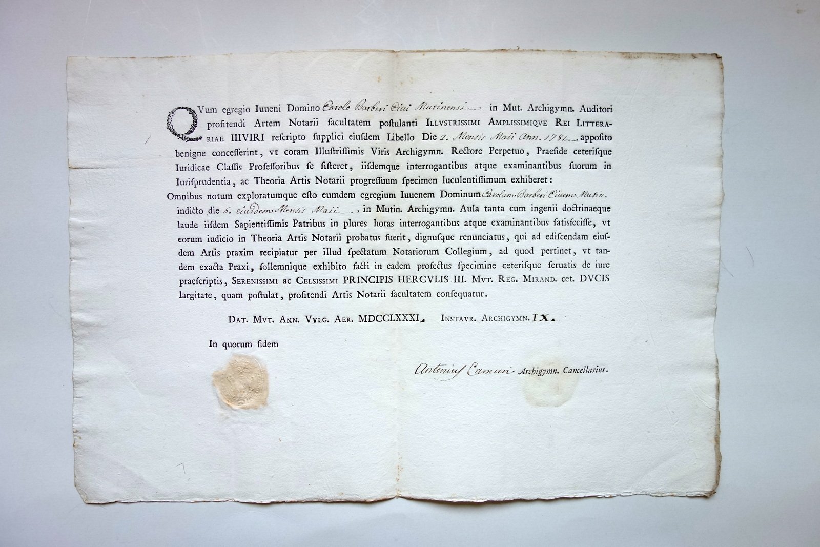 Attestato Theoria Artis Notarii Notariato Barberi Mutinensis 1781 Sigillo