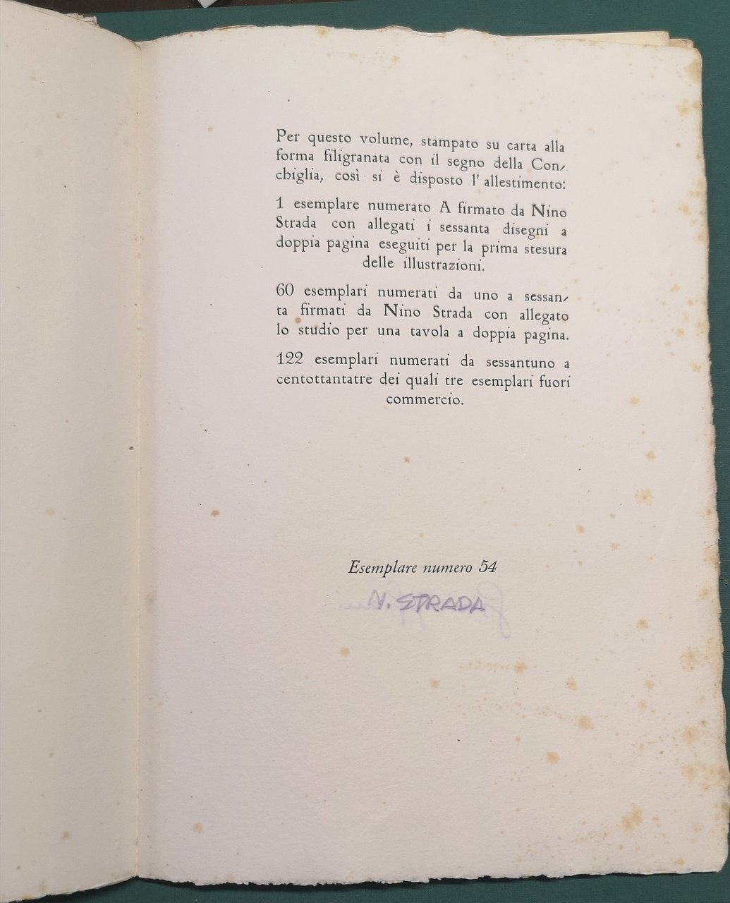 >in-4, pp. (156) a quartini sciolti, con illustrazioni litografiche ai margini del testo e 2 tavole a piena pagina di Nino Strada, capilettera decorati.; cartella editoriale figurata, entro custodia in cartonato (usurata). Edizione di pregio, impressa su carta di stracci a mano, in soli 183 esemplari numerati, ns. 54, uno dei 60 firmati da Nino Strada (ma purtroppo mancante del disegno originale allegato). Buon esemplare (minime e sporadiche fioriture della carta).
