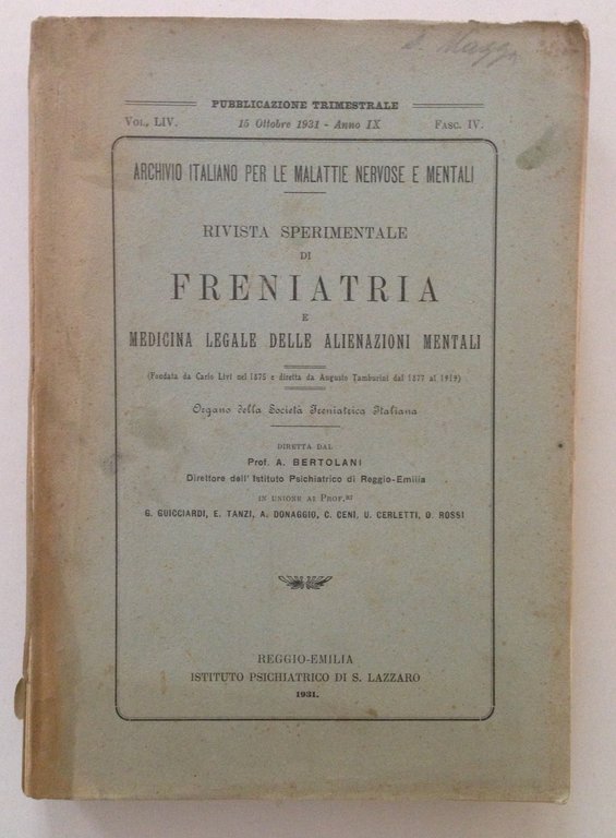AA.VV., ATTI DEL XIX CONGRESSO SOCIETA' FRENIATRICA ITALIANA IN RIVISTA SPERIMENTALE DI FRENIATRIA E MEDICINA LEGALE DELLE ALIENAZIONI MENTALI FERRARA 24 - 27 APRILE 1930 REGGIO EMILIA, IST. PSICHIATRICO DI SAN LAZZARO 1931, in 8°, pp. da 651 a 1262, con ill. n.t. e 14 tavv. rip. f.t., br. ed. Condizioni di conservazione Esemplare in buono stato con tracce d'uso e qualche brunitura; dorso restaurato, ingiallito per esposizione alla luce, peraltro buon esemplare. MM1119.E3-122