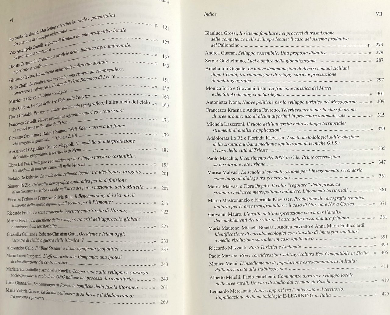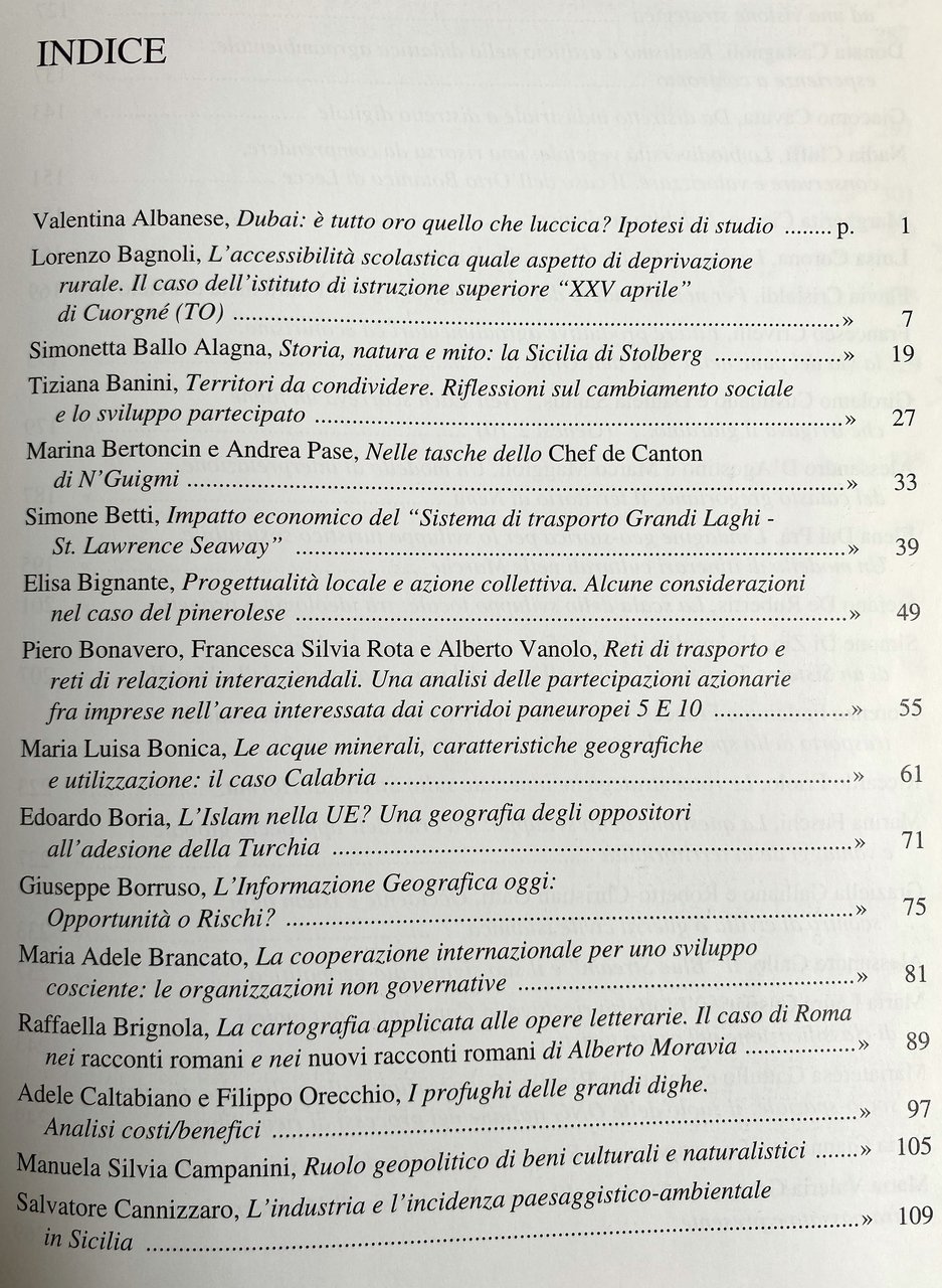 Soggetti: Geografia Scritti Saggi Antologie Raccolte Valentina Albanese Dubai Lorenzo Bagnoli Rurale Istruzione superiore XXV aprile Cuorgné Simonetta Ballo Alagna Storia Natura Mito Sicilia Stolberg Tiziana Banini Territori Cambiamento sociale Marina Bertoncin Andrea Pase Chef de Canton N'Guigmi Simone Betti Impatto economico Trasporti Grandi Laghi Lawrence Seaway Elisa Bignante Progettualità locale Azione collettiva Pinerolese Piero Bonavero Francesca Silvia Rota Vanolo Reti Relazioni Analisi Corridoi paneuropei Maria Luisa Bonica Acque minerali Calabria Edoardo Boria Islam UE Turchia Borruso Informazione Geografica Rischio Adele Brancato Cooperazione internazionale Organizzazioni non governative Raffaella Brignola Cartografia Opere letterarie Roma Racconti romani Alberto Moravia Caltabiano Filippo Orecchio Profughi Dighe Costi benefici Manuela Campanini Geopolitica Beni culturali naturalistici Ecologia Ambiente Economia Protezione Ambientalismo Inquinamento Clima Cambiamenti climatici Bernardo Cardinale Marketing Territorio Consorzi Vito Arcangelo Carulli Porto Brindisi Donata Castagnoli Didattica Giacomo Cavuta Distretto industriale Digitale Nadia Chiffi Biodiversità Orto Botanico Lecce Margherita Ciervo Debito ecologico Corona Diga Tre Gole Yangtze Cina Flavia Cristaldi Crivelli Filiere produttive agroalimentari Ecoturismo Valle dell'Orta Via del pane Girolamo Cusimano Daniela Santus Alessandro D'Agostino Marco Maggioli Catasto gregoriano Nemi Flena Dai Prà Geo-storica Turistico Gianluca Grossi Competenze Palloncino Guaran Sviluppo sostenibile Sergio Guglielmino Globalizzazione Amelia Ioli Gigante Monica Iorio Giovanni Sistu Fruizione turistica Siti Archeologici Sardegna Antonietta Ivona Politiche Krasna Favretto Michela Lazzeroni Università Addolorata Lo Rè Florinda Klevisser Musei Struttura Trieste Paolo Macchia Censimento Cile Riviste Marche Stefano De Rubertis Di Zio Demografia Maiella Fiorenzo Ferlaino Benchmarking Alpino Piemonte Riccardo Friolo Rotte strategiche Stretto Hormuz Fuschi Crisi Territorialità Graziella Galliano Roberto-Christian Gatti Occidente Scontro Civiltà Guerra civile Gallo Blue Stream Laura Gasparini Offerta ricettiva Campania Mariateresa Gattullo Antonella Rinella Giustizia socio-spaziale ONG Ilaria Giannarini Campagna Romana Bonifiche Litoranea Valeria Grasso Al Idrisi Mediterraneo Marisa Malvasi Scuola Specializzazione Insegnamento Flora Pagetti Stranieri Milanese Mastronunzio Gorizia Nova Gorica Mauro Bassa pianura friulana Mautone Micaela Bonessi Maria Frallicciardi Immagini satellitari Risoluzione spaziale Mazzanti Porti Turistici Mazzeo Agricoltura Meini Insediamenti Popolazione Extracomunitari Italia Precarietà Melelli Fabio Fatichenti Baschi Leonardo Mercatanti E-LEARNING Carolina Mimmo Parco Archeologico Botromagno Gravina Puglia Armando Montanari Gusto Enogastronomia Elisabetta Miorelli Bocchetti Morri Immigrati Cittadinanza Elena Palma Abitazioni popolari Case Qualità Edilizia Urbanistica Architettura Davide Papotti West americano Barbara Parise Gioia Tauro Pioletti Olimpiadi invernali Club services Corradina Rosanna Polto Siracusa Aurora Portelli Concetta Rizzo Testuzza Alessandra Ramarro Fissero-Tartaro-Canalbianco Sandro Rinauro Mercato Guglielmo Tagliacarne Teorie Gravitazione Giuseppe Rocca Innovazione Trasformazioni Ghilla Roditi Paesaggio metropolitano Ronconi GIS Storica Marietta Salvo Urbanesimo Città digitali Paola Savi Sbordone Gentrification Riurbanizzazione Corso a distanza Formazione Primaria Tresivio-Sondrio Marcella Schmidt Friedberg Mandala Kumagusu Minakata Scorrano Integrazione Anna Segre Egidio Dansero Domenico De Leonardis Sellari Orietta Selva Conflitti Venezia Serenissima Sfruttamento Sale Caterina Imarisio Cristiano Giorda Enrico Squarcina Sussidiari Staniscia Deconcentration Governance Michele Stoppa Teresa Taviano Tendenze Medea Terrana Progetti Treves Meridionalismo Ferdinando Milone Francesco S. Nitti Napoli Tecnologia Helsinki Torino Varotto Montagne Vestito Equosolidale Congressi Seminari Libri rari fuori catalogo Collezionismo Scienze ambientali territoriali Urbanismo postmoderno Di Blasis Censis Istat Diritti umani Containers Geologia De Vecchis Tobin Vallega Geography Writings Essays Anthologies Collections Rural Higher education History Nature Myth Sicily Territories Social change Economic impact Transport Great Lakes Local planning Collective action Networks Relations Analysis Pan-European corridors Mineral waters Turkey Geographic information Risk International cooperation Non-governmental organizations Cartography Literary works Rome Roman stories Refugees Dams Costs and benefits Geopolitics Naturalistic cultural heritage Ecology Environment Economy Protection Environmentalism Pollution Climate Climate change Territory Consortia Port Teaching Industrial district Digital Biodiversity Botanical garden Ecological debt Dam China Agri-food production chains Ecotourism Land register Geo-historical Tourist Skills Sustainable development Globalization Tourist use Archaeological sites Sardinia Policies University Museums Structure Census Chile Magazines Demography Alps Strategic routes Territoriality West Clash of civilizations Civil war Hospitality offer Socio-spatial justice Roman countryside Land reclamation Coastal Mediterranean Specialization Teaching Plain Satellite images Spatial resolution Tourist ports Settlements Population Non-EU citizens Italy Precariousness Archaeological park Taste Food and wine Immigrants Citizenship Social housing Houses Quality Construction Urban planning Architecture American Winter Olympics Market Theories Gravitation Innovation Transformations Metropolitan landscape Historical Urbanism Digital cities Reurbanization Distance learning Training Integration Venice Exploitation Halls Trends Technology Mountains Fair trade Congresses Seminars Rare books out of print Collecting Territorial environmental sciences Postmodern urbanism Human rights Geology