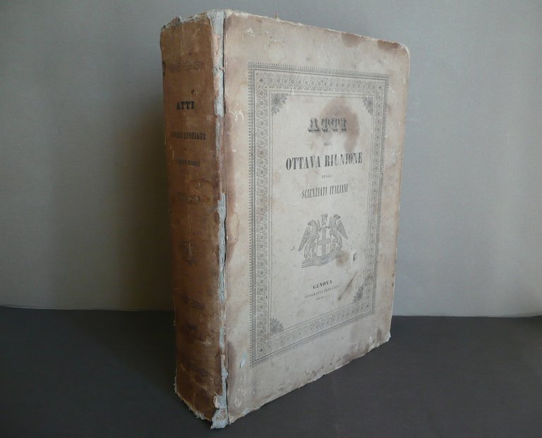 AA. VV., Atti della Ottava Riunione degli Scienziati italiani Tenuta in Genova dal XIV al XXIX Settembre 1846 Tipografia Ferrando, Genova 1847, cm 32x23,5, pp. I-VIII; pp. 1-1004 con 9 tavole incise in b/n f. t. (una è rip.); legatura in tutto cartonato ed. con titolo al dorso e, riquadrato entro cornice, al piatto ant. Edizione numerata (n/s 239), dedicata e con firme di due Deputati dal Consiglio dei Ragionieri" (vedi foto). Condizioni di conservazione Esemplare complessivamente in buone condizioni con tracce del tempo; coperta con vari aloni e piccole gore di vecchia umidità che non interessano le pagine; alcune abrasioni, strappetti e mancanze prevalentemente ai margini, agli angoli dei piatti, alle cerniere e alle cuffie (vedi foto). Interni complessivamente molto ben conservati, quasi totalmente intonsi e con qualche piccola leggerissima brunitura. Edizione numerata (n/s 239), dedicata e con firme di due "Deputati dal Consiglio dei Ragionieri" (vedi foto). Interni ancora quasi totalmente intonsi, complessivamente molto ben conservati. SETT92.L8496 N "