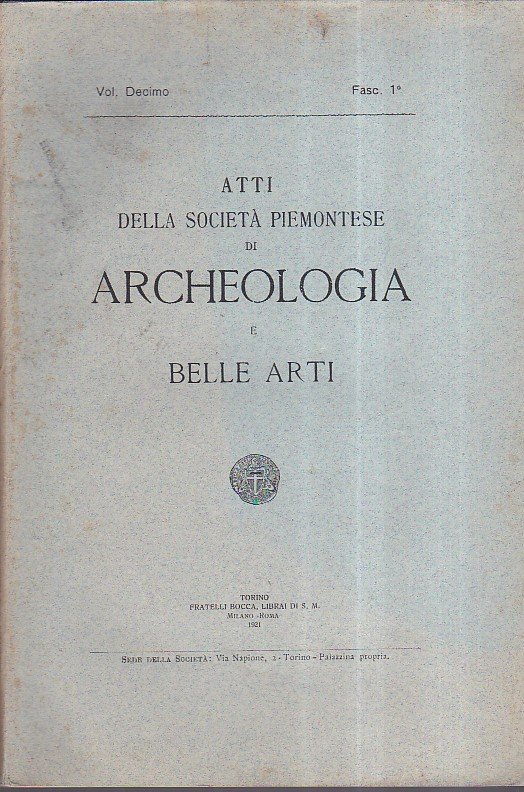 2 fascicoli in-8°, pp. (4), 89; (2), 333-361, (1) [paginazione continua]; brossure originali. 8 tavole f.t. (anche ripiegate) al primo fascicolo, 20 tavole f.t. al terzo (non è presente il secondo fascicolo). Bell'esemplare. Contributi di Piero Barocelli (I sepolcreti preromani di Ameno), Ferdinando Rondolino (Il praetorium di Torino), Attilio Bonino (Pietro e Giovanangelo Dolce), Eugenio Olivero (La Chiesa romanica di Santa Fede in Cavagnolo; tale contributo occupa l'interezza del terzo fascicolo).