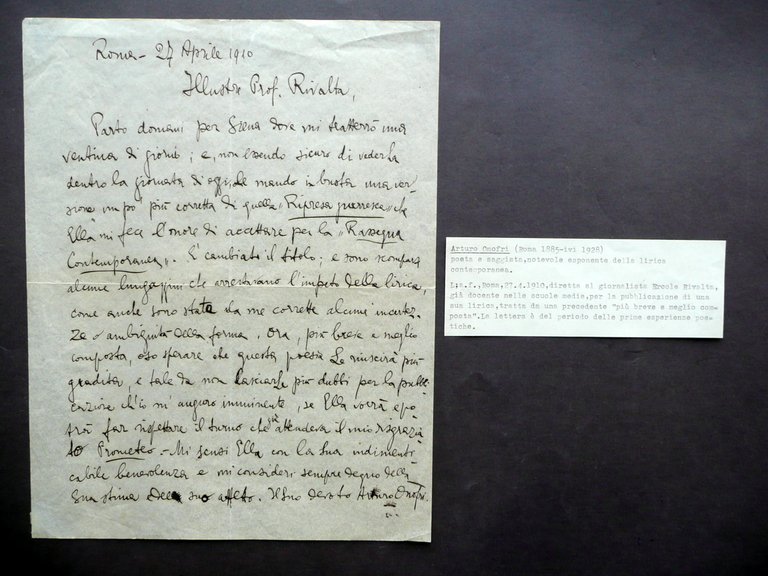 Lettera autografa, Arturo Onofri (Roma 1885 - Ivi 1928) Lettera autografa firmata Datata Roma, 27 aprile 1910 Lettera interamente autografa e firmata, redatta su foglio in carta simil velina, datata Roma, 27 aprile 1910; testo e firma disposti ad un'unica facciata, con firma autografa al termine del testo (vedi foto). Cm 25,5x20. Accluso uno schedino dattiloscritto del precedente collezionista che contiene una breve biografia dell'Onofri e una descrizione dell'autografo (vedi foto). Condizioni di conservazione Lettera ben conservata con tracce d'uso, normali tracce di pieghe di spedizione, un angolo inf. con un paio di lievi tracce di piccole pieghette; retro con piccole tracce di nastro adesivo dovute a precedente inserimento dell'esemplare in album, e una leggera annotazione a matita del precedente collezionista (vedi foto). Interessante lettera interamente autografa, diretta al giornalista e professore Ettore Rivalta: [.] Le mando in busta una versione un po' più corretta di quella 'ripresa guerresca' che ella mi fece l'onore di accettare per la 'Rassegna Contemporanea'. è cambiato il titolo; e sono scomparse alcune lungaggini che arestavano l'impeto della lirica [.] Ora, più breve e meglio composta, oso sperare che questa poesia le riuscirà più gradita [.]". (per ulteriori informazioni sull'Onofri e sul contenuto dell'autografo vedi foto schedino). SC03.D12455 N "