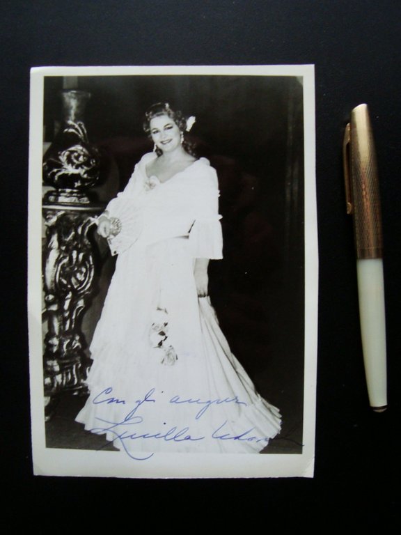 Fotografia autografa, Lucilla Udovich Fotografia originale con dedica e firma autografe Grande otografia originale in bianco e nero con dedica e firma autografe. Cm 18x12,5. Condizioni di conservazione: Esemplare in buone condizioni con leggere tracce del tempo, margini ed angoli con qualche piccola traccia di pieghetta, retro con leggere macchiette al margine superiore (vedi foto). SC03.D14002 blu