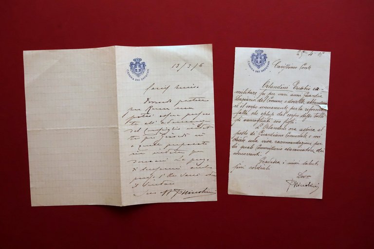 2 lettere con firma autografa, Pietro Niccolini (1866-1939) 2 lettere con firma autografa (testi di mano segretariale) redatte su carta intestata della Camera dei Deputati datate 25/04/1905 e 13/03/1906 1905-06; due lettere redatte su carta intestata della Camera dei Deputati; testi di pugno segretariale, con firma autografa a penna del Niccolini al termine di ciascuna lettera. Cm 18x11 e 17x11. Condizioni di conservazione Entrambe in buone condizioni con minime tracce d'uso, margini minimamente rifilati, una lettera con un paio di piccoli strappetti al margine destro. Poche trascurabili bruniture. SC03.D18967 N