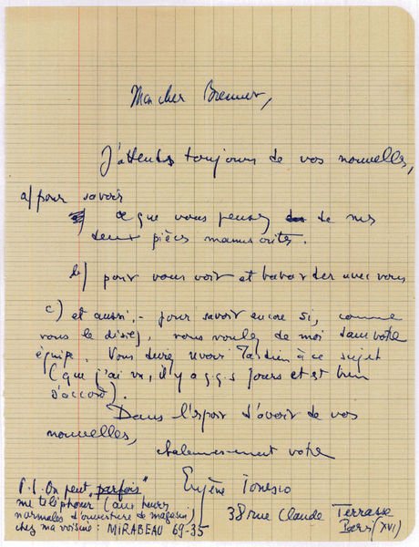 4to. 1 p. With autograph envelope. To the writer and friend Jacques Brenner (1922-2001), asking for his opinion on two of Ionesco's manuscripts and asking him to arrange a meeting, also in connection with Brenner's newly founded literary magazine Les Cahiers des Saisons: "J'attends toujours de vos nouvelles, a) pour savoir ce que vous pensez de mes deux pièces manuscrites. b) pour vous voir et bavarder avec vous c) et aussi - pour savoir encore si, comme vous le disiez, vous voulez de moi dans votre équipe. Vous deviez revoir Tardieu [Jean Tardieu] à ce sujet (que j'ai vu il y a qqs jours et est bien d'accord)". In a charming short postscript, Ionesco explains how he can be reached by telephone: "On peut 'parfois' me téléphoner (aux heures d'ouverture de magasin chez ma voisine [.]" - Traces of folds.