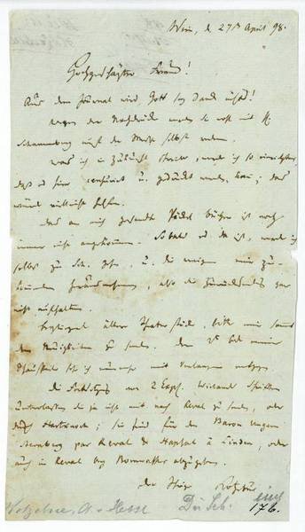 8vo. 1 p. To his publisher Paul Gotthelf Kummer (1750-1835), during his short and unsuccessful tenure as director of the Vienna Burgtheater, rejoicing that he will not, after all, be saddled with the job of editing a theatre weekly (a project resented by the actors as well as by himself): "Hochgeschätzter Freund! Aus dem Journal wird Gott sey Dank nichts! Wegen der Nachdrucke werden Sie wohl mit H. Schauenburg auf der Messe selbst reden. Was ich in Zukunft schreibe, werde ich so einrichten, daß es hier censurirt u. gedruckt werden kann; das würde vielleicht helfen. Das an mich gesandte Päckl Bücher ist noch immer nicht angekommen. So bald es da ist, werde ich selber zu Sch. gehen, u. die wenigen mir zukommenden herausnehmen, also die Zurücksendung gar nicht aufhalten. Beyliegende ältere Theaterstücke bitte mir sammt den Neuigkeiten zu senden. Dem 2ten Bde. meiner Schauspiele sehe ich nunmehr mit Verlangen entgegen. Die Fortsetzung von 2 Expl. Wielands Schrifften unterlassen Sie ja nicht mit nach Reval zu senden, aber durch Hartknoch; sie sind für den Baron Ungern-Sternberg par Reval & Hapsal à Linden, oder auch in Reval bey Bornwasser abzugeben [.]". - With the recipient's notes on the verso and an old collector's note in red ink: "21. Mai 1881 erh.".