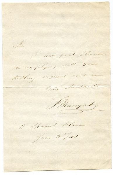 8vo. 1 p. To an unnamed addressee: "I have great pleasure in complying with your [.] request and am Your obedient | FMarryat [.]". - Slightly browned due to paper; small traces of former mounting on the reverse; small tear to one edge with old reinforcement.