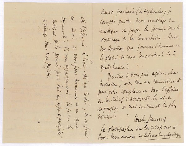 Small-8vo. 3 pp. on bifolium. Interesting letter to a friend in Marseille, anticipating a meeting and thanking him for his support in the "affair of the bas-relief of Aristarche". This refers to the contested interpretation of the fragment of a Roman altar that had been donated to the Académie de Marseille in 1802 as a depiction of Aristarche, the mythical Greek founder of Marseille. While Maurras and the recipient supported the Aristarche-thesis, other scholars saw a depiction of Iphigenia. Maurras refers to the bas-relief in his 1901 novel "Anthinéa : d’Athènes à Florence". In a postscript to the letter, Maurras promises to send a foto of the bas-relief and an issue of the Revue encyclopédique devoted to Aristarche to the recipient as "they belong" to him. - The letter in full: "Veuillez m'excuser, moi aussi, du retard que j'ai mis à vous répondre. J'ai trouvé votre lettre si bienveillante et trop flatteuse à mon égard au retour d'un petit voyage en Corse. Si on me l'eût envoyée à Marseille, je n'aurais pas manqué d'aller vous saluer pendant le séjour que j'ai fait dans votre grande ville. Je vous croyais absent. Mais Samedi prochain (4 septembre, je compte quitter mon ermitage du Martigue et passer la journée dans le voisinage de la Cannebière [.]). Veuillez-je vous prie agréer, cher Monsieur, avec tous mes remerciements pour votre complaisance dans l'affaire du bas-relief d'Arsitarché, la vive expression de mes sentiments les plus distingués". Postscript: "Les photographies du bas-relief sont à Paris. Mon numéro de la Revue Encyclopédique est également à Paris. Dès ma rentrée, je me ferai un devoir de vous faire hommage de ces deux documents : Ils vous appartiennent. Et je vous les destinai dès le premier jour. Seul un départ précipité a dérangé tous mes projets". - "Chemin de paradis" was the name that Maurras gave his family home in Martigues and also the title of his first book, published in 1895. - Well preserved.