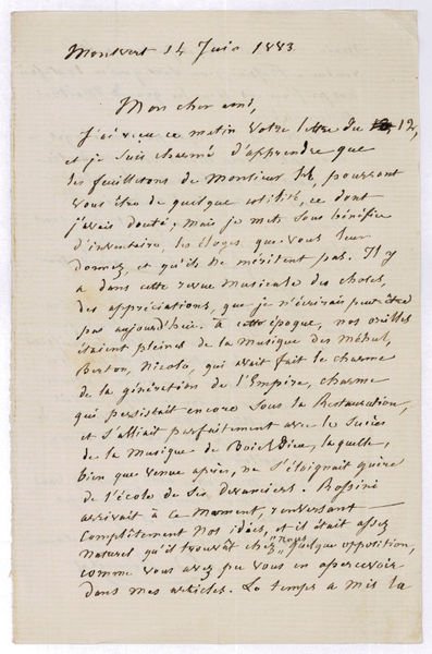 8vo. 2 pp. Charming letter to the journalist and music critic Charles Vincens, thanking him for his praise of Rémusat's old music criticisms in the Revue musicale and offering his support for Vincens bid for a seat of the Académie de Marseille. Despite Vincens' eulogies, Rémusat criticizes his own writing, specifically his strong opposition to the music of Gioachino Rossini, although he prefers the "great German composers" to this day: "Il y a dans cette Revue musicale des choses, des appréciations, que je n'écrirais peut-être pas aujourd'hui. À cette époque, mes oreilles étaient pleines de la musique de Méhul, Berton, Nicolo, qui avait fait le charme de la génération de l'empire, charme qui persistait encore sous la Restauration, et s'alliait parfaitement avec le succès de la musique de Boieldieu, laquelle, bien que venue après, ne s'éloignait guère de l'école de ses devanciers. Rossini arrivait à ce moment, renversant complètement nos idées, et il était assez naturel qu'il trouvât chez nous quelque opposition, comme vous avez pu vous en apercevoir dans mes articles. Le temps a mis la main sur tout cela, et justice a été rendue à Rossini, non sans toutefois garder nos préférences pour les grands maîtres allemands". Concerning the Académie de Marseille, Rémusat announces to write a letter of support to the naturalist and academy member Gaston de Saporta. Vincens was elected to the Académie in 1883. - Well preserved.