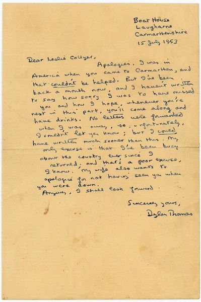 8vo. ¾ p. Dear Leslie Collier, Apologies. I was in America when you came to Carmarthen, that couldn't be helped. But I've been back a month now, and I haven't written to say how sorry I was to have missed you and how I hope, whenever you're next in this part, you'll come along and have drinks. No letters were forwarded when I was away, so unfortunately, I couldn't let you know; but I could have written much sooner than this. My only excuse is that I have been busy about the country ever since I returned; and that's a poor excuse, I know. My wife also wants to apologise for not having seen you when you were down. Anyway, I shall look forward. Sincerely yours, Dylan Thomas. - A few light stains, and some mounting remnants on the verso, otherwise very fine. From the collection of Diana Herzog.