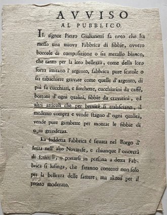 Avviso al Pubblico. Fabbrica di fibbie del Settecento. Il signor Pietro Giulianetti fa noto che ha messo una nuova fabbrica di fibbie, ovvero boccole di composizione o sia metallo bianco, che tanto per la loro bellezza, come della loro forza imitano l’argento, fabbrica pure scatole o sia tabacchiere gravate come quelle d’argento, di più fa cucchiari e forchette, cucchiarini da caffè, bottoni d’ogni qualità, fibbie da cravatini, ed altri articoli che per brevità si tralasciano... La suddetta Fabbrica è situata nel Borgo d’Intra nell’alto Novarese...