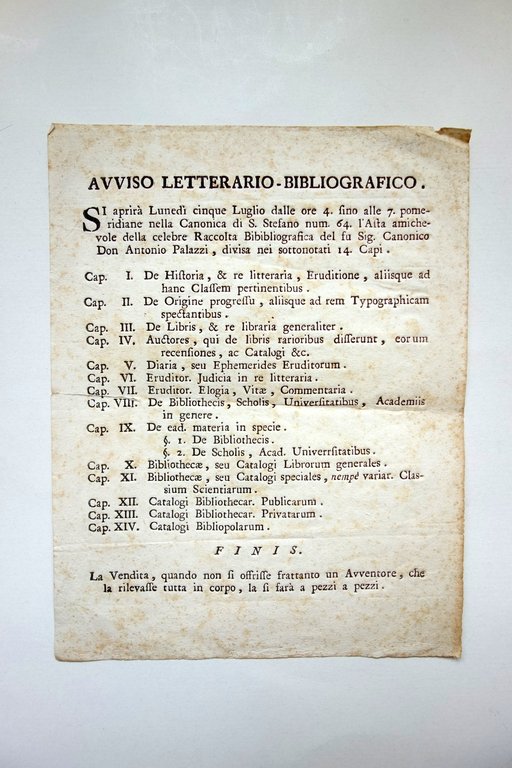 Avviso d'asta, Avviso letterario - bibliografico Si aprirà lunedì cinque luglio dalle ore 4 fino alle ore 7 pomeridiane nella Canonica di S. Stedano num. 64 l'Asta amichevole della celebre raccolta bibliografica del fu Sig. Canonico Don Antonio Palazzi [.]" Senza dati tip., s. d. (primo '800 circa); avviso a stampa su foglio in carta. Retro bianco. Cm 22,5x17,5. Condizioni di conservazione Esemplare in buone condizioni con tracce d'uso, piega centrale di conservazione, alcune piccole leggere bruniture, traccia di pieghetta all'angolo superiore destro. Piccolo taglietto a un'estremità della piega centrale. SC03.D17080 N "